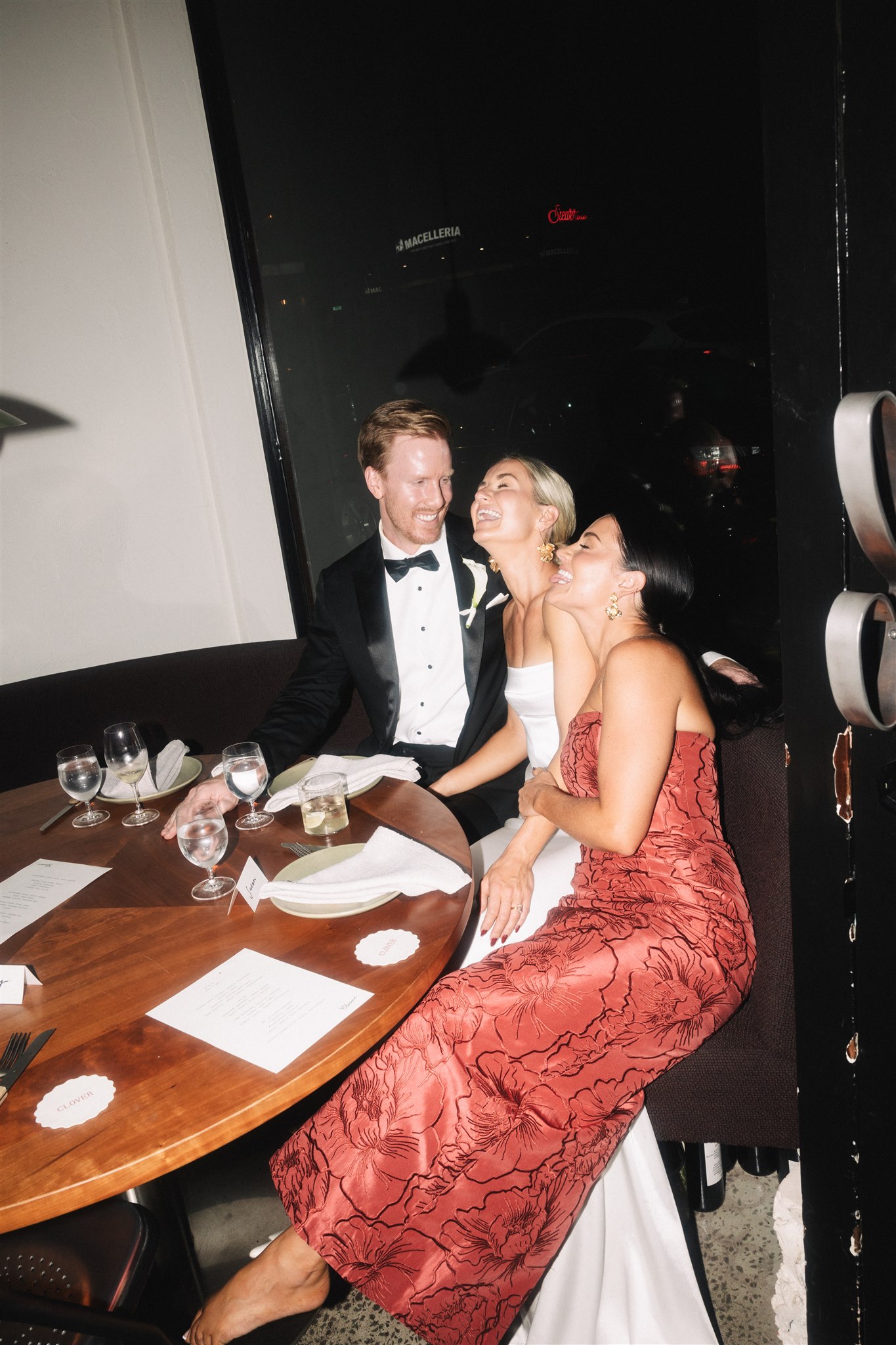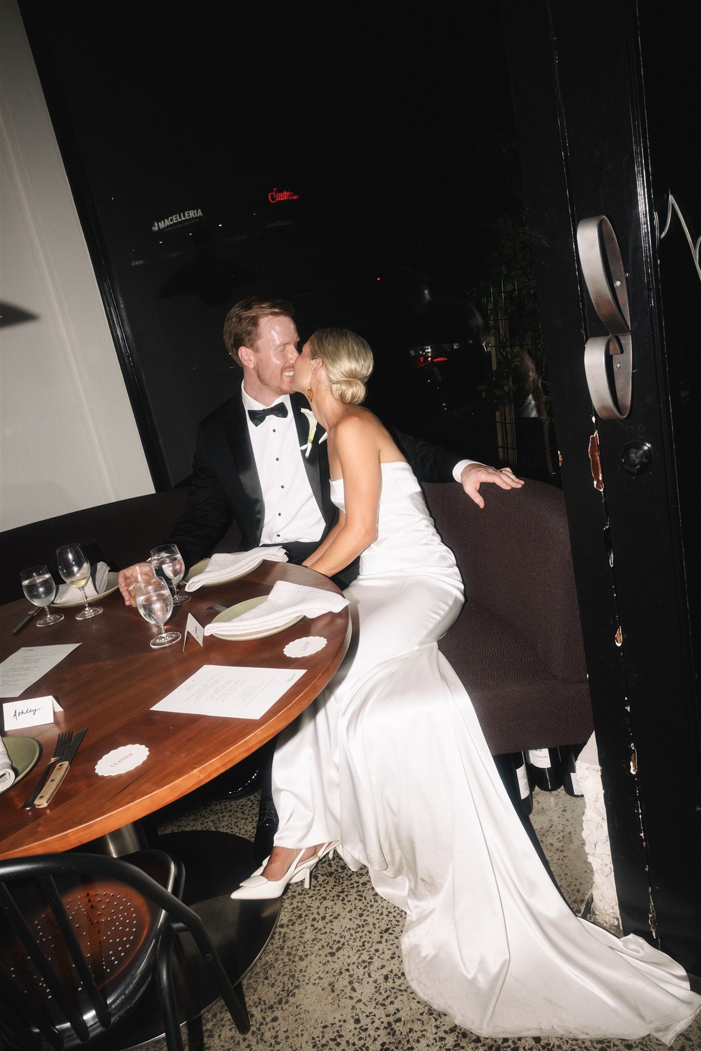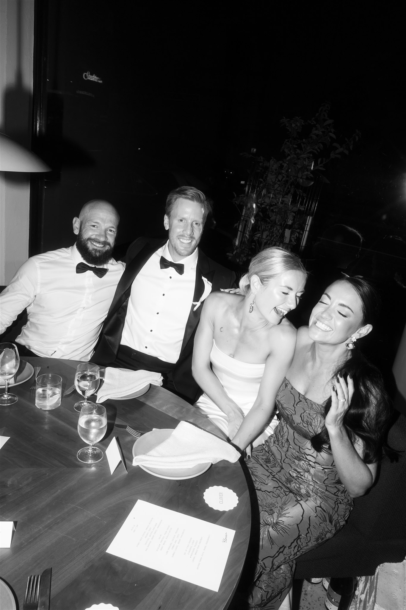 The evening began in Clover’s courtyard with a relaxed cocktail hour, complete with a fresh oyster bar. As the night settled in, everyone moved inside for a cosy, love-filled, dinner party-style reception. Long tables, flowing wine, and incredible food made for an unforgettable night. The warmth of the space, paired with the closeness of family and friends, made it feel like an intimate family dinner at home. Rather than a traditional wedding — exactly what Abby and Sam had dreamed of.