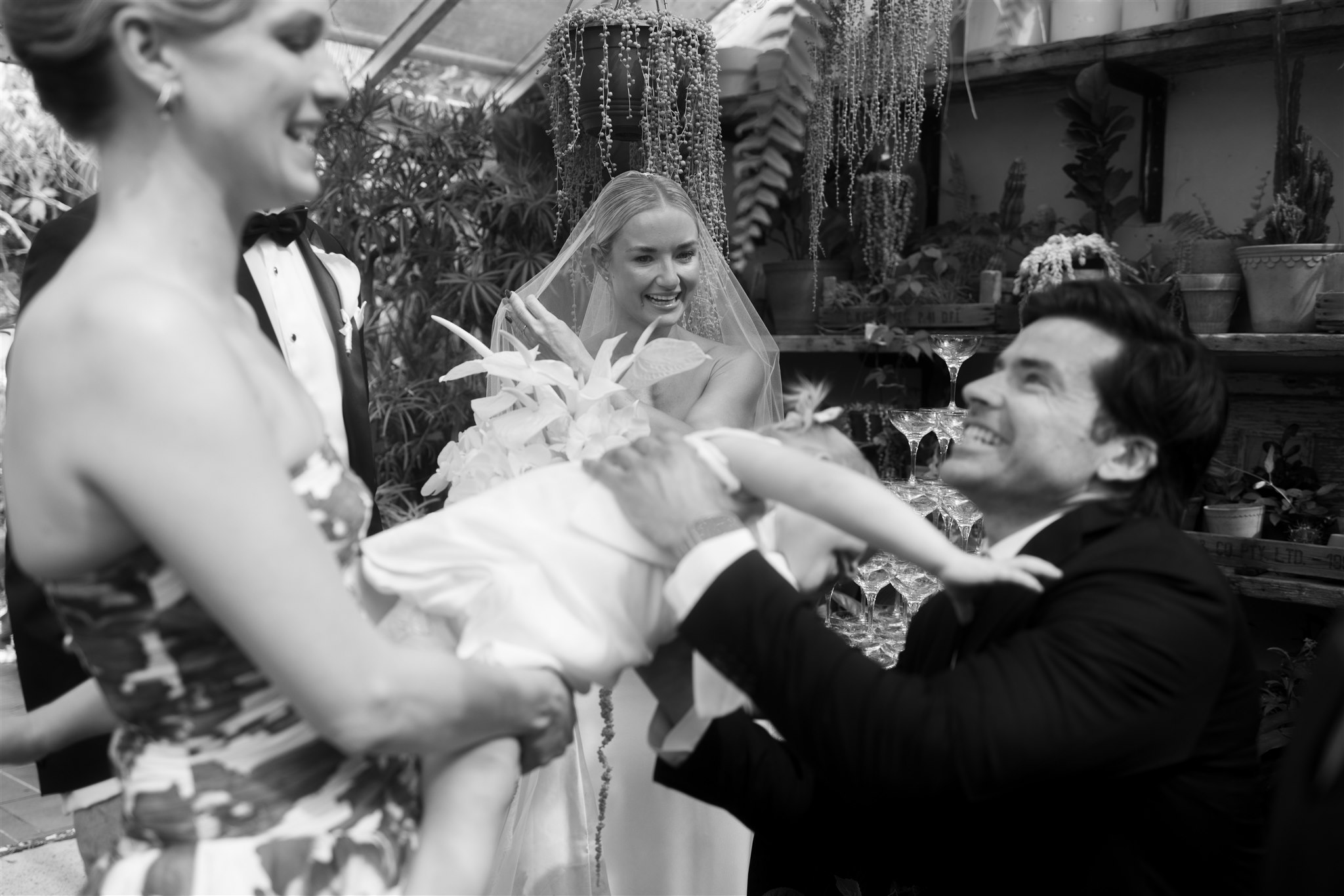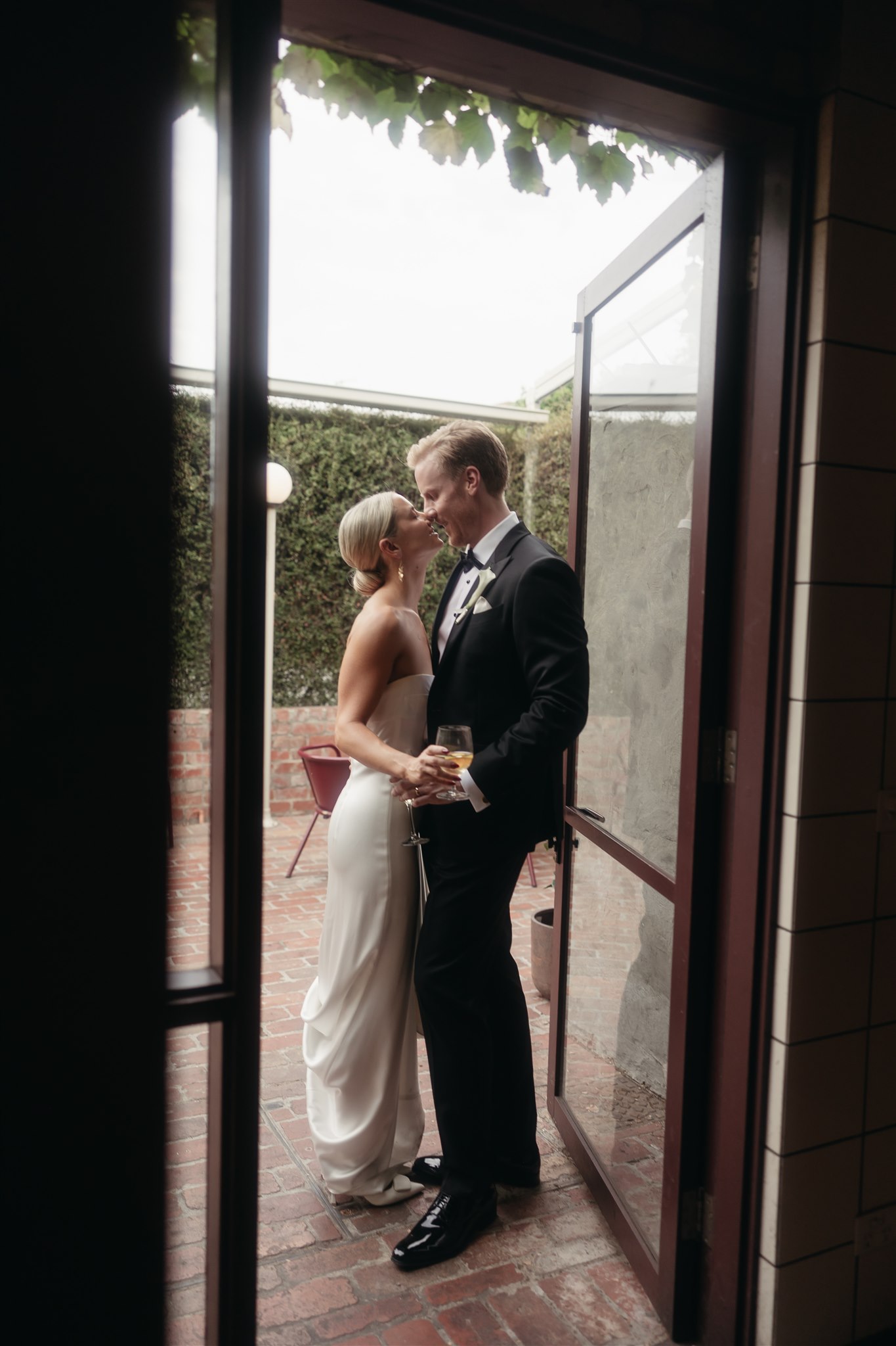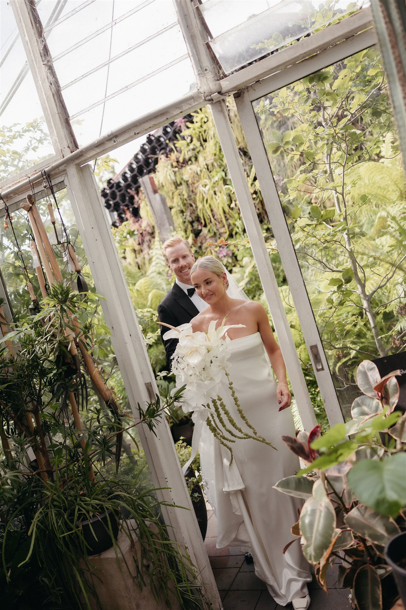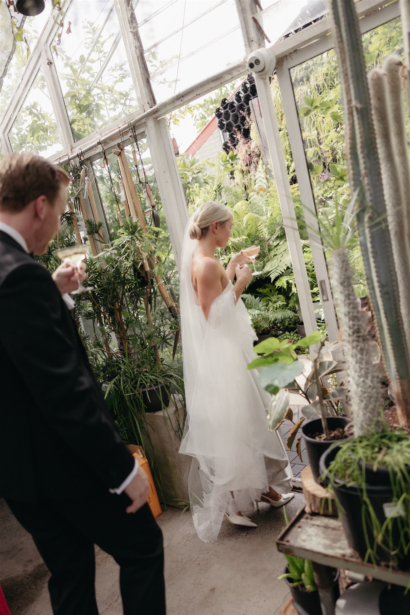 The day began with a beautiful wedding ceremony at Glasshaus, a lush, urban greenhouse-style Melbourne wedding venue. Surrounded by greenery and soft natural light streaming through the glass, Abby and Sam exchanged vows. After the ceremony, they celebrated with an elegant champagne tower, setting the tone for a relaxed and love-filled evening.