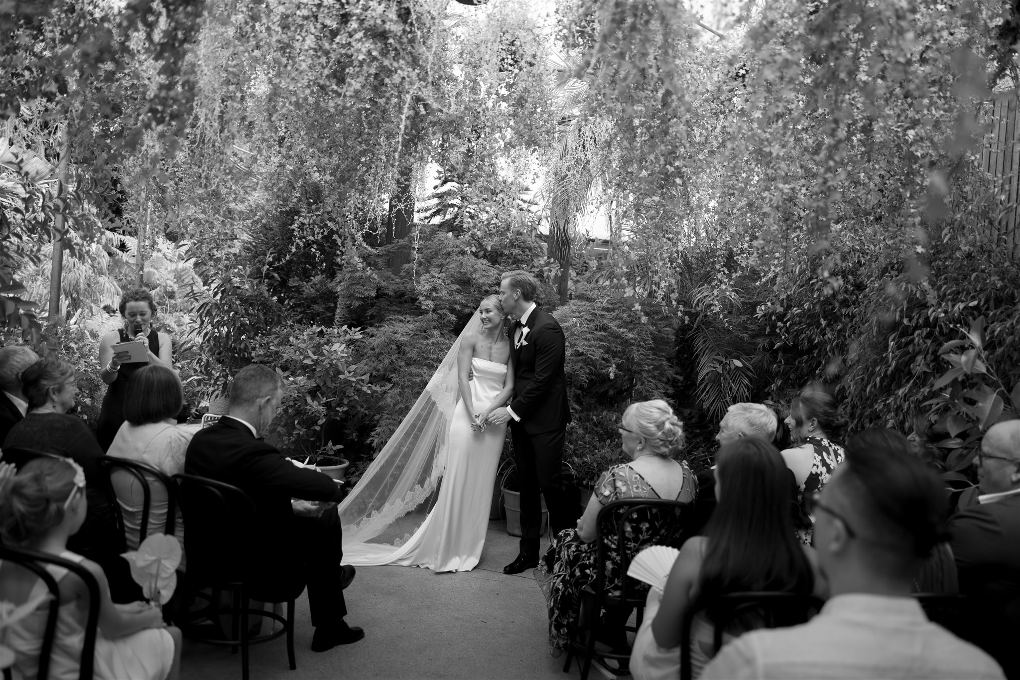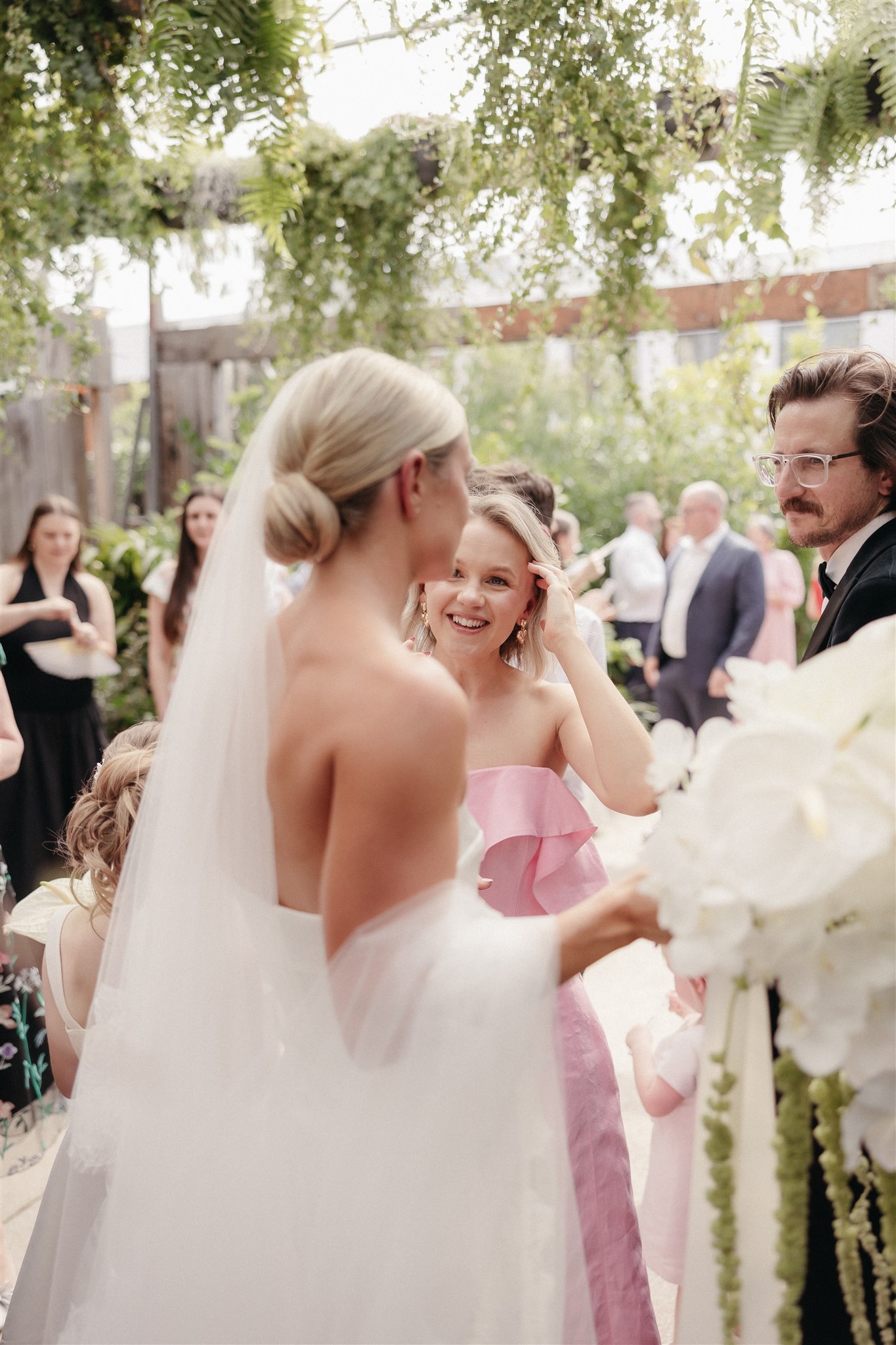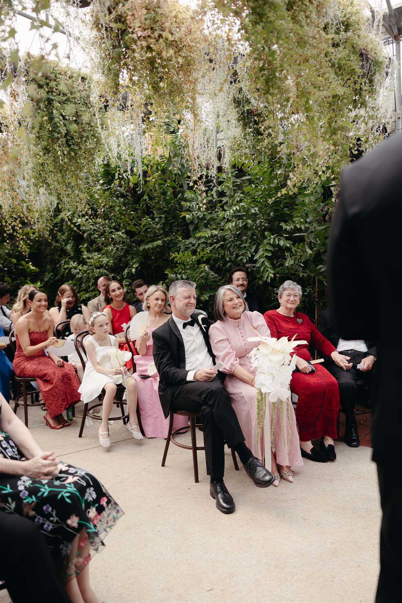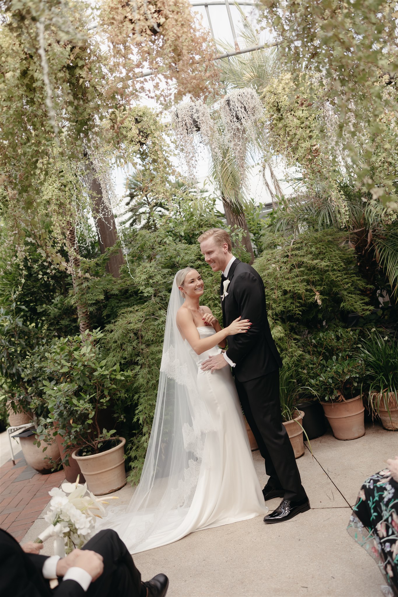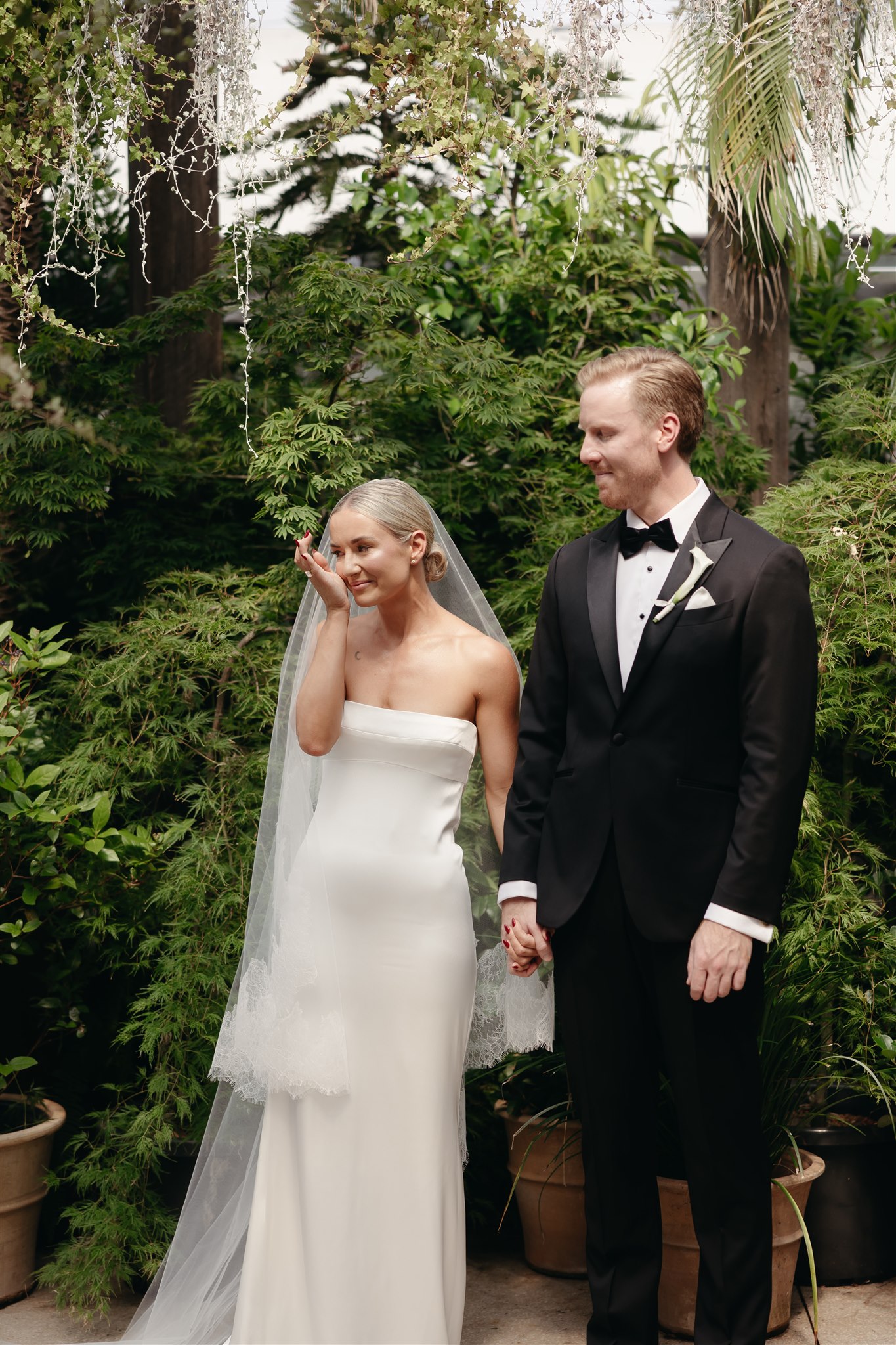 The day began with a beautiful wedding ceremony at Glasshaus, a lush, urban greenhouse-style Melbourne wedding venue. Surrounded by greenery and soft natural light streaming through the glass, Abby and Sam exchanged vows. After the ceremony, they celebrated with an elegant champagne tower, setting the tone for a relaxed and love-filled evening.