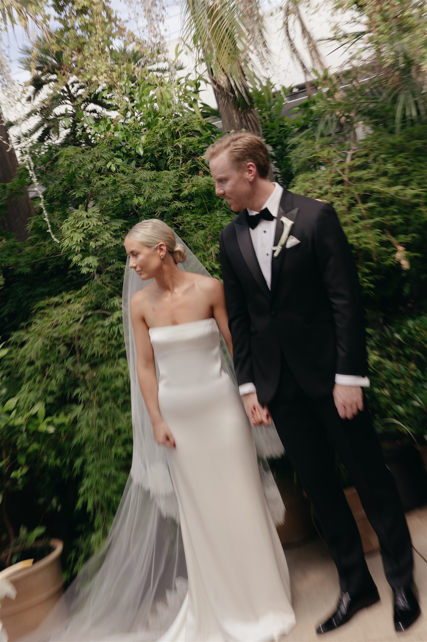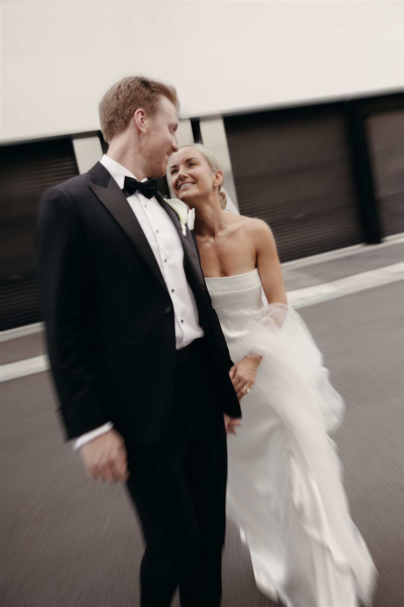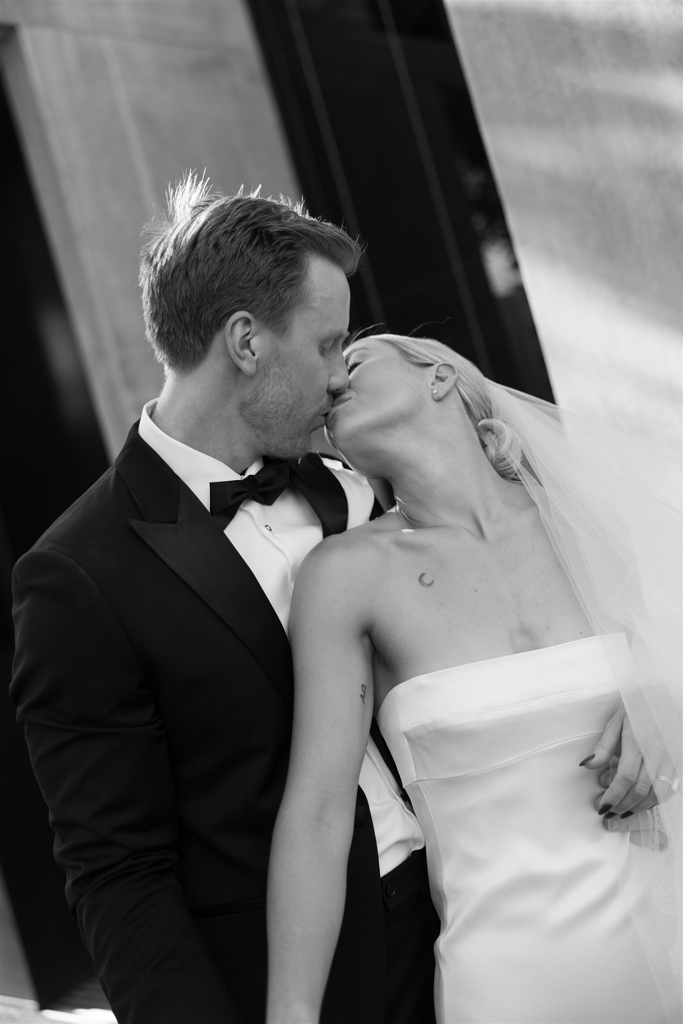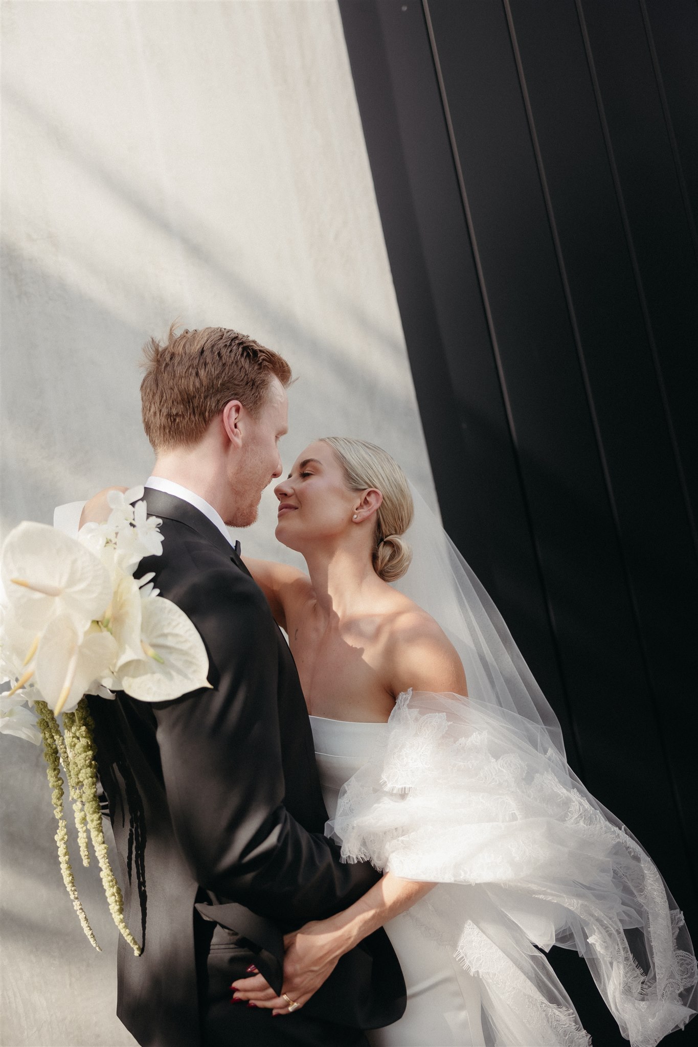 Abby looked stunning in a sleek, minimalist gown by Kyha Studios paired with a long flowing veil, her bridal look was effortlessly elegant. The perfect match for the modern, pared-back feel of the day.