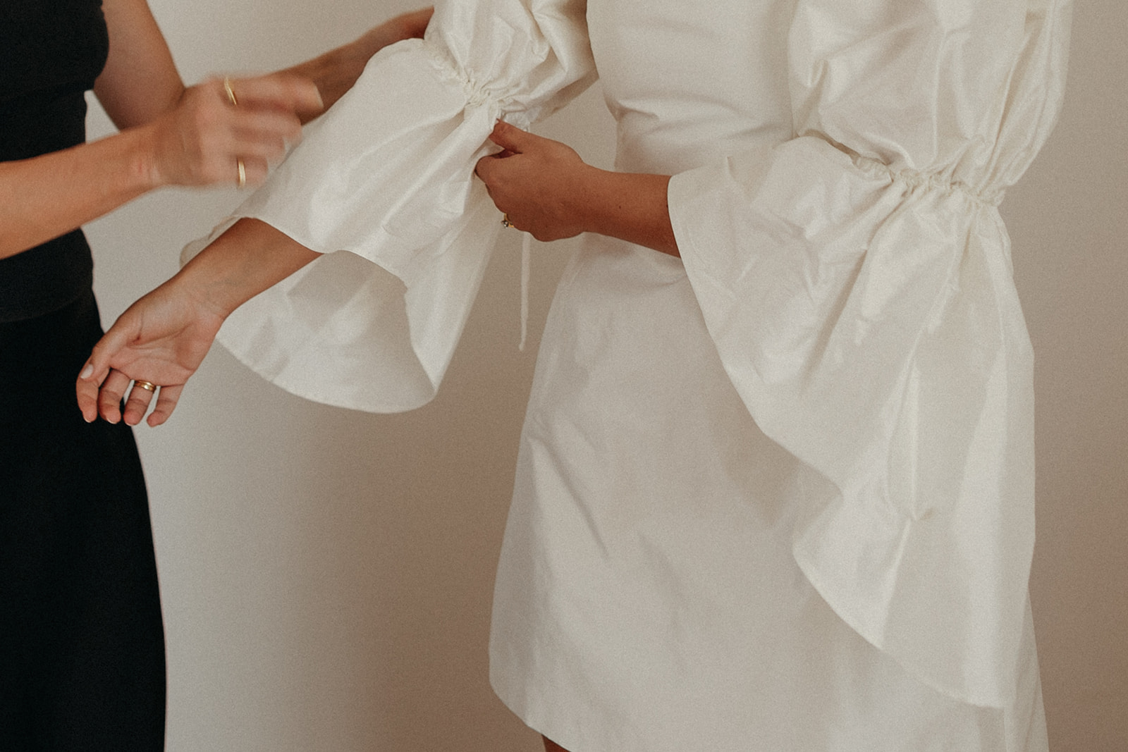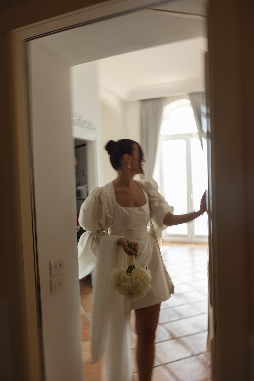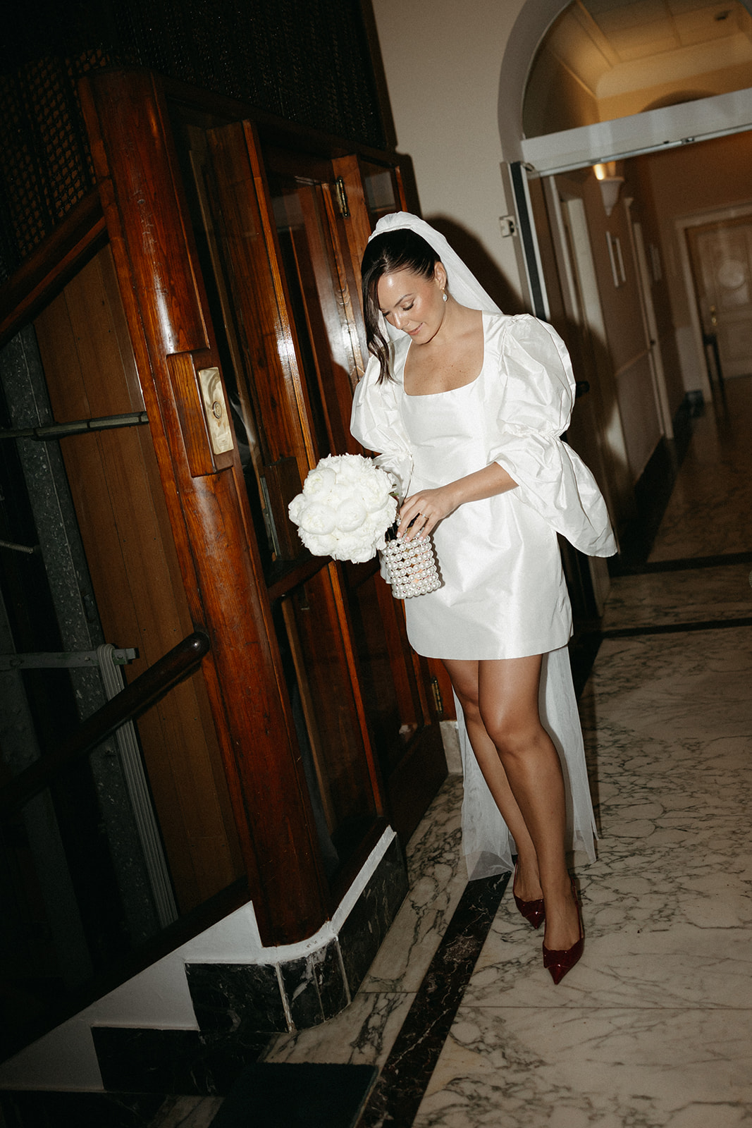Liv’s bridal look was timeless with a modern edge. She wore a mini gown by Van Der Kooij, a Melbourne-based Australian wedding dress designer. Celebrated for her architectural yet romantic silhouettes.