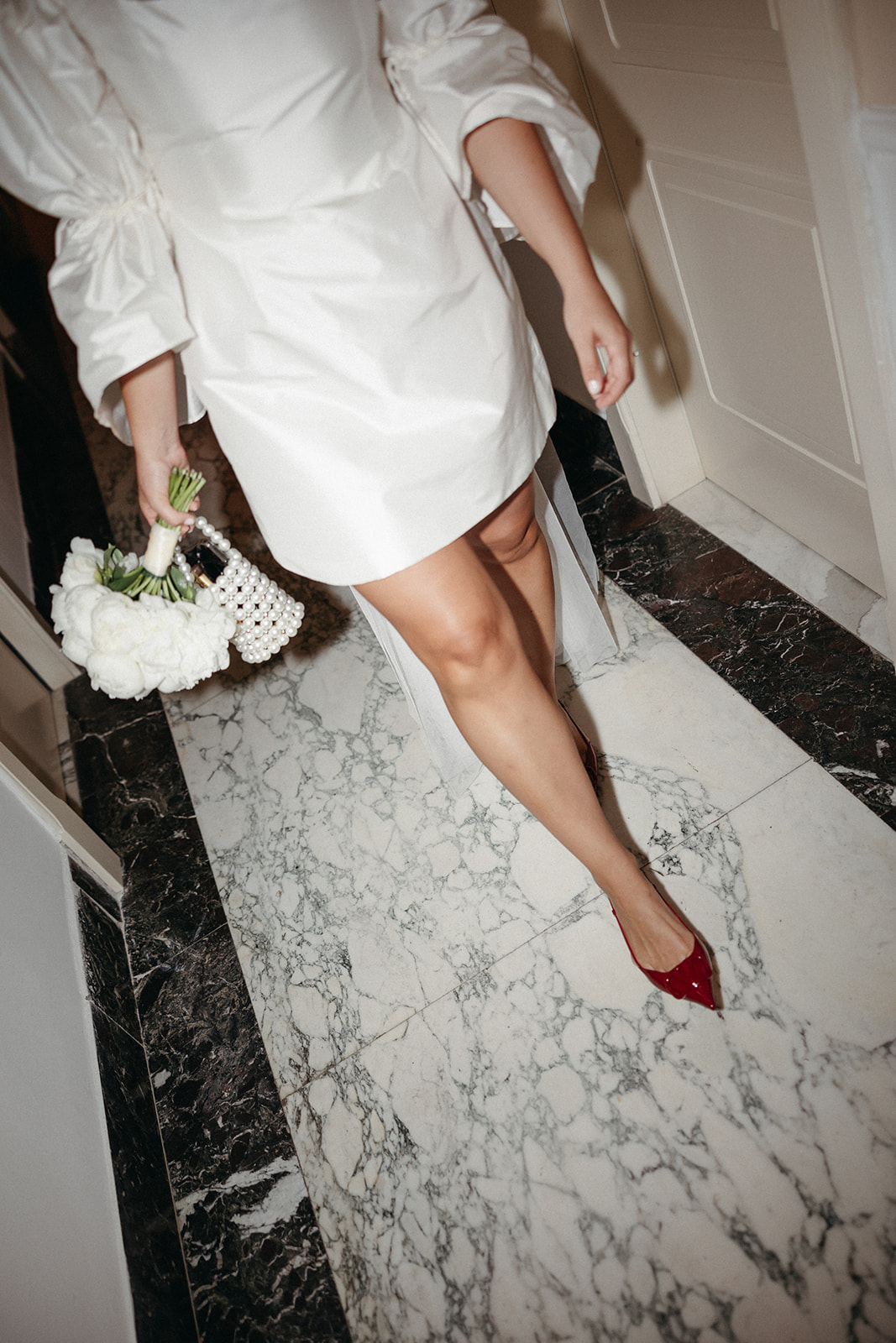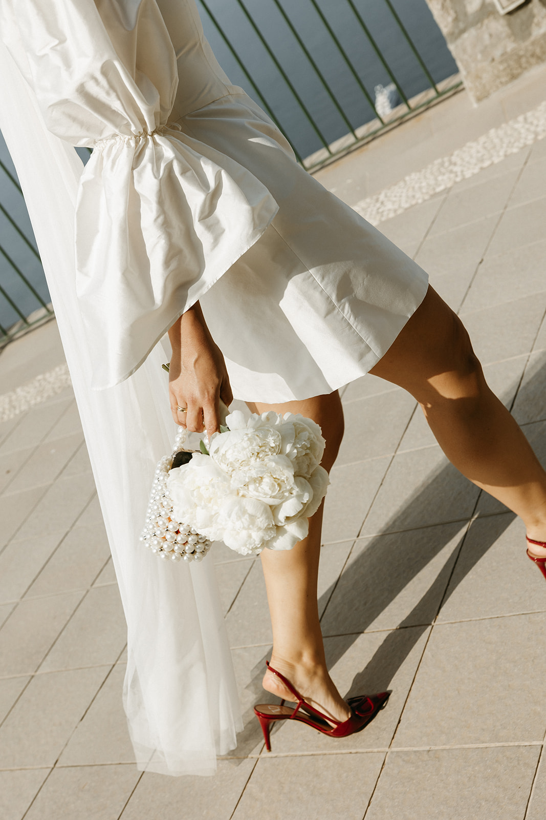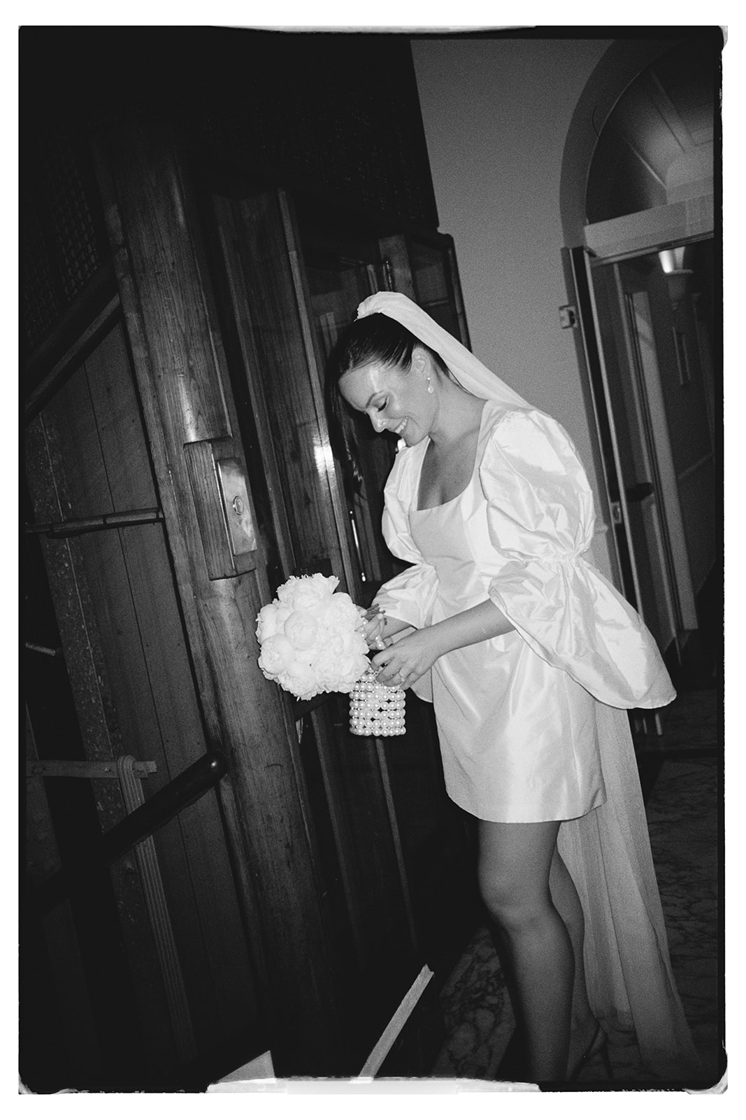 Liv’s bridal look was timeless with a modern edge. She wore a mini gown by Van Der Kooij, a Melbourne-based Australian wedding dress designer. Celebrated for her architectural yet romantic silhouettes.