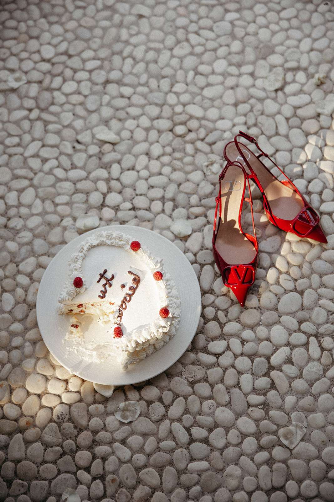She paired it with bold Maison Valentino red heels, creating an unexpected, bold statement against the neutral tones of Capri’s landscape.