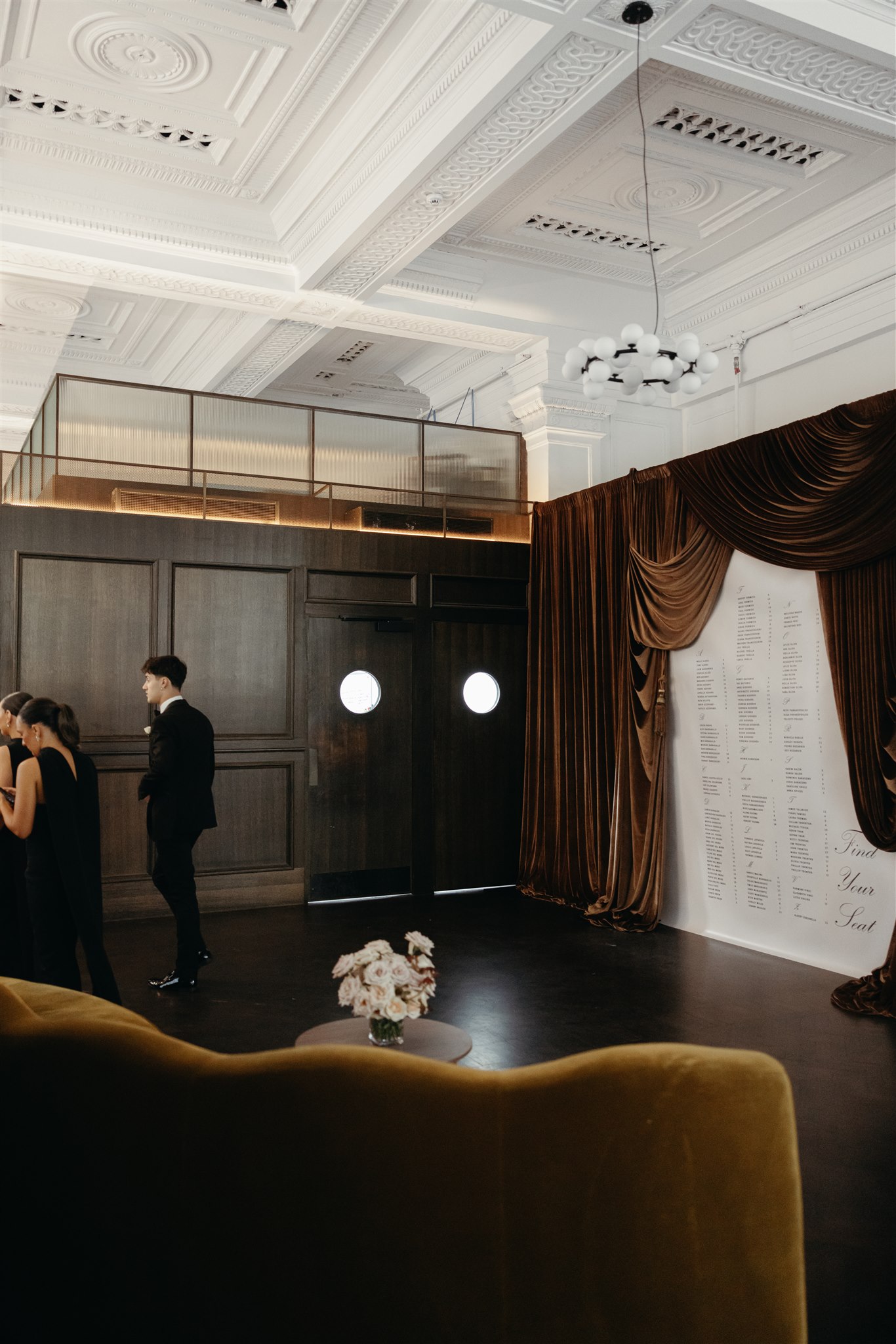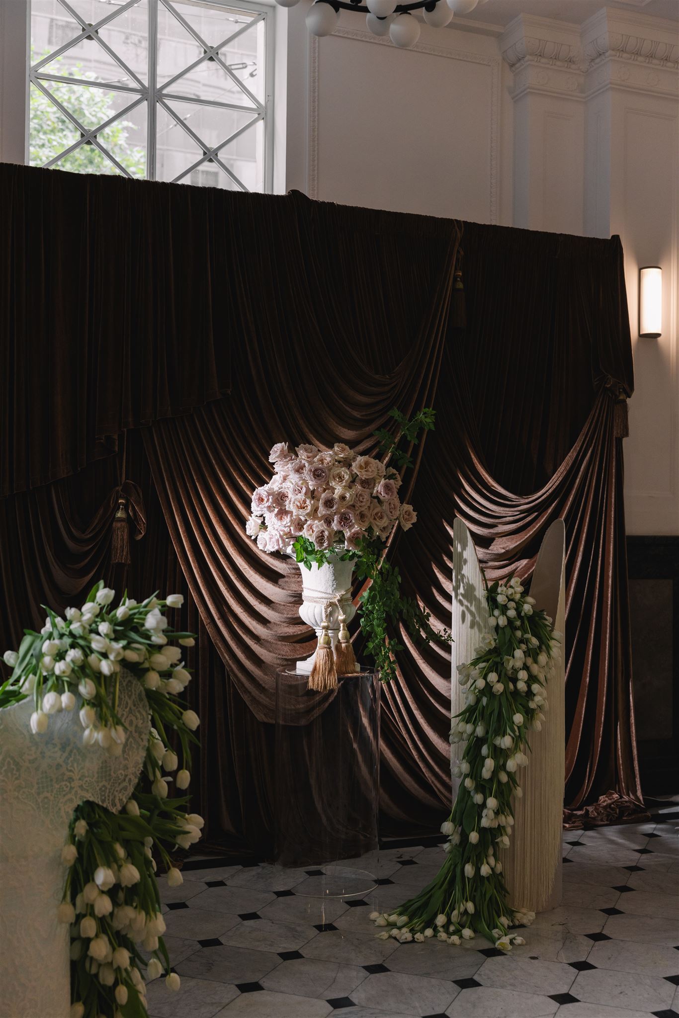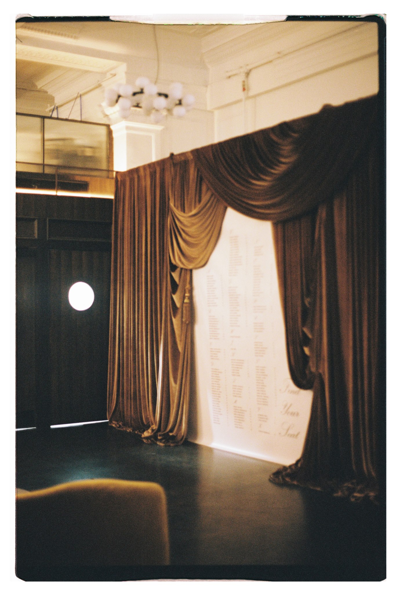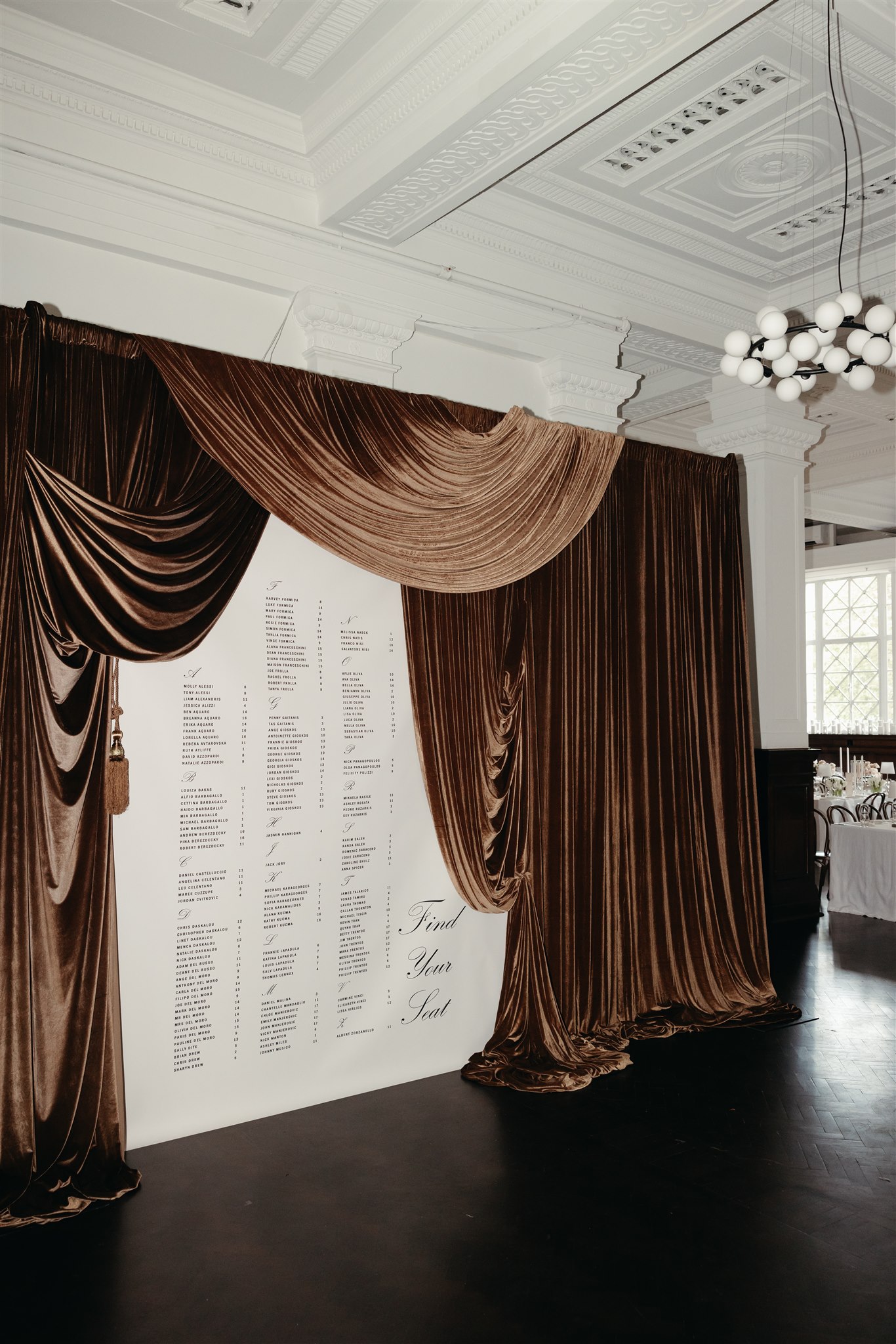 Instead of a traditional photo booth, Maxine and Phill opted for a live portrait photography booth. The mocha brown velvet draped backdrop was styled with handmade plinths crafted by Philoxi Styling, adorned with beautiful draping florals by florist Blonde Florals.