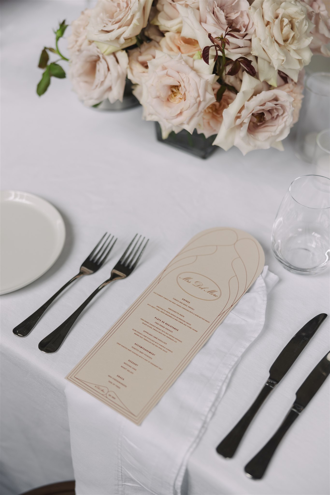 When it came to the overall theme of the wedding, Maxine shared with Vogue “We wanted our wedding to feel like a romantic date night at an Italian Bistro”. Maxine worked with Vanessa from Philoxi Styling to turn The Trust Melbourne Wedding Venue into “Bistro del Moro”. Taking inspiration from the glamour of the Roaring Twenties in Manhattan, they blended modernity and nostalgia in an Italian bistro haute design dream.