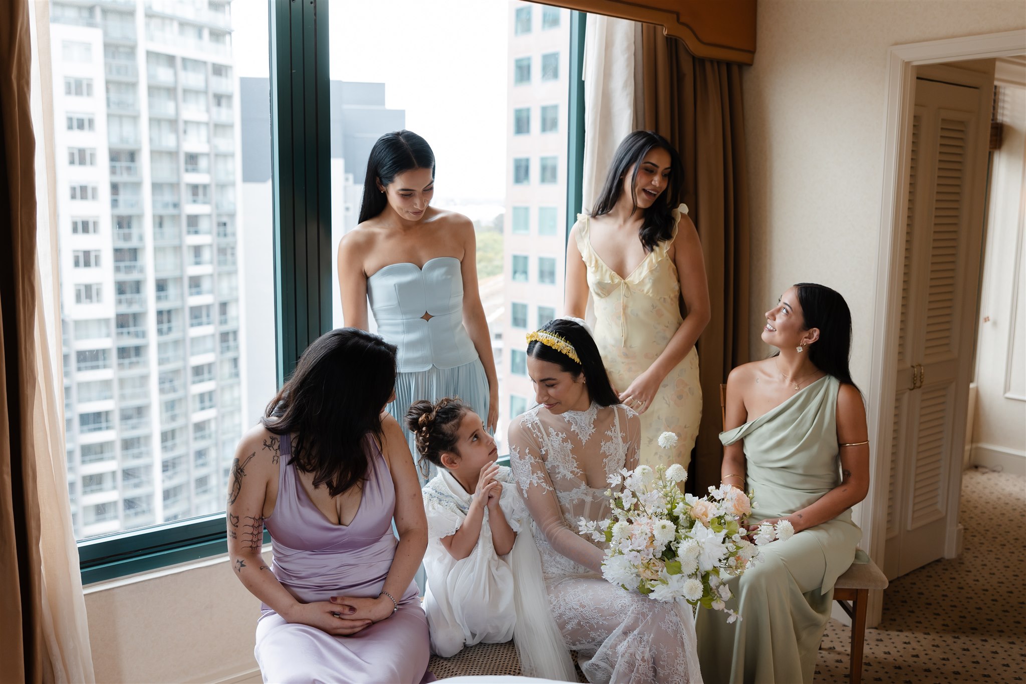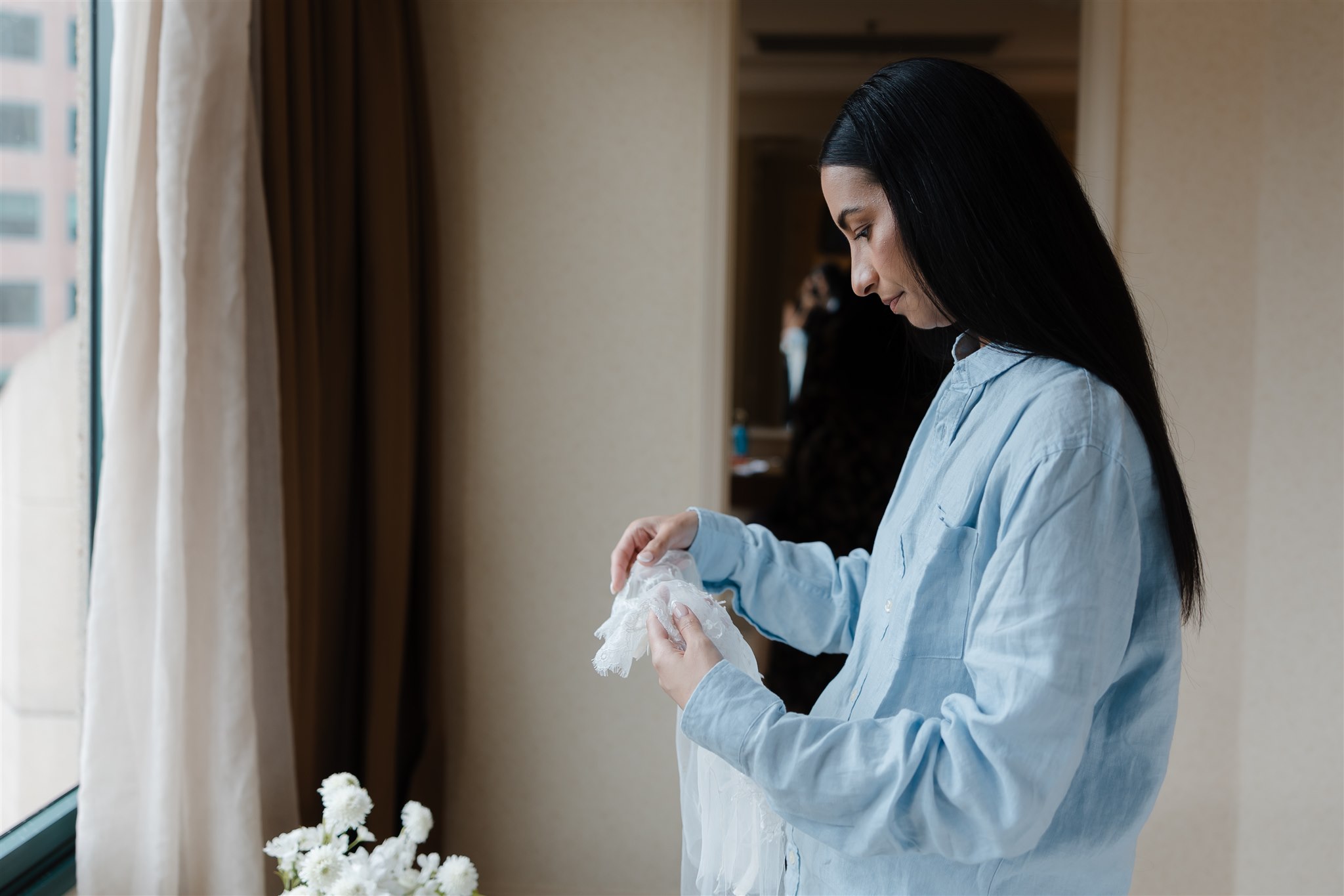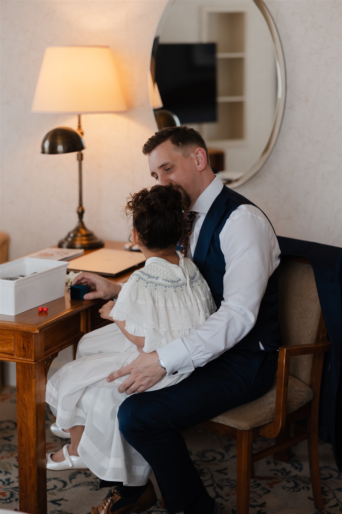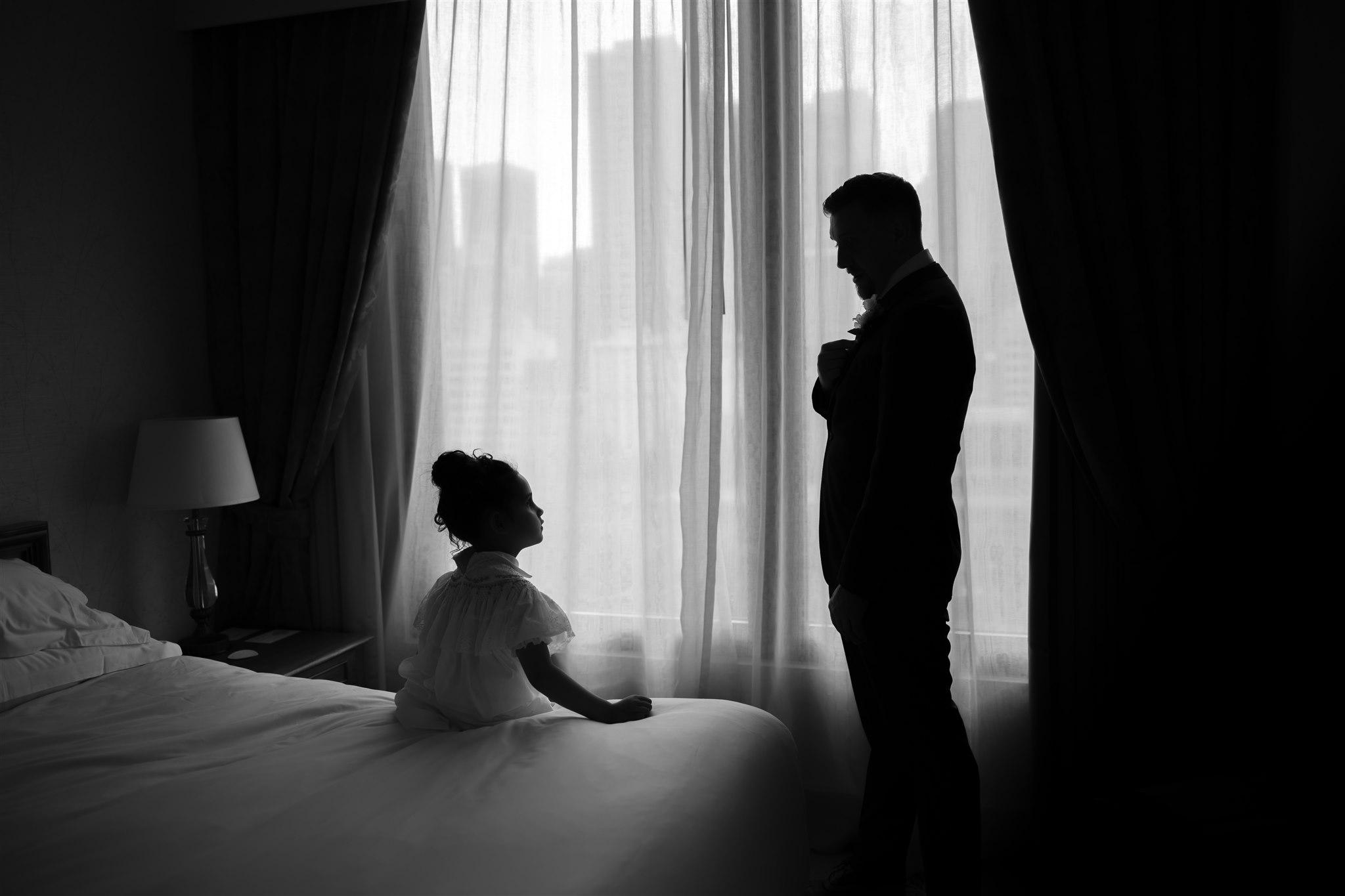 It was important to include their daughter, Evelyn, in as many aspects of the day as possible. The three of them stayed together the night before, cherishing those final moments together before their big day. Again the next morning, Evelyn was there, getting ready with the girls before heading over to Chris’ room to spend time with him.