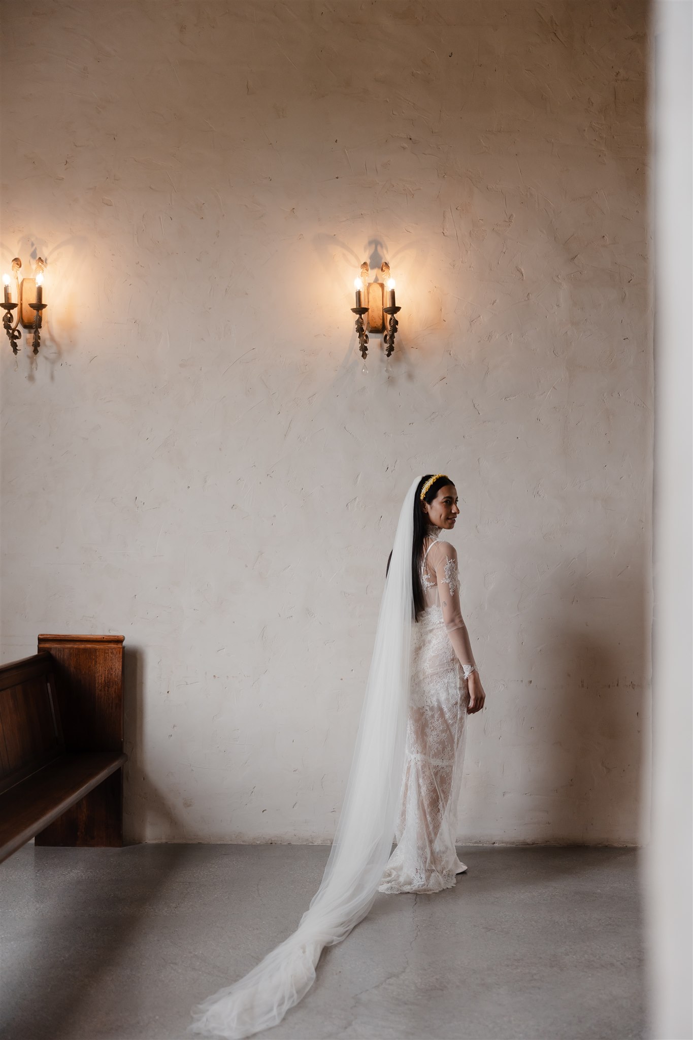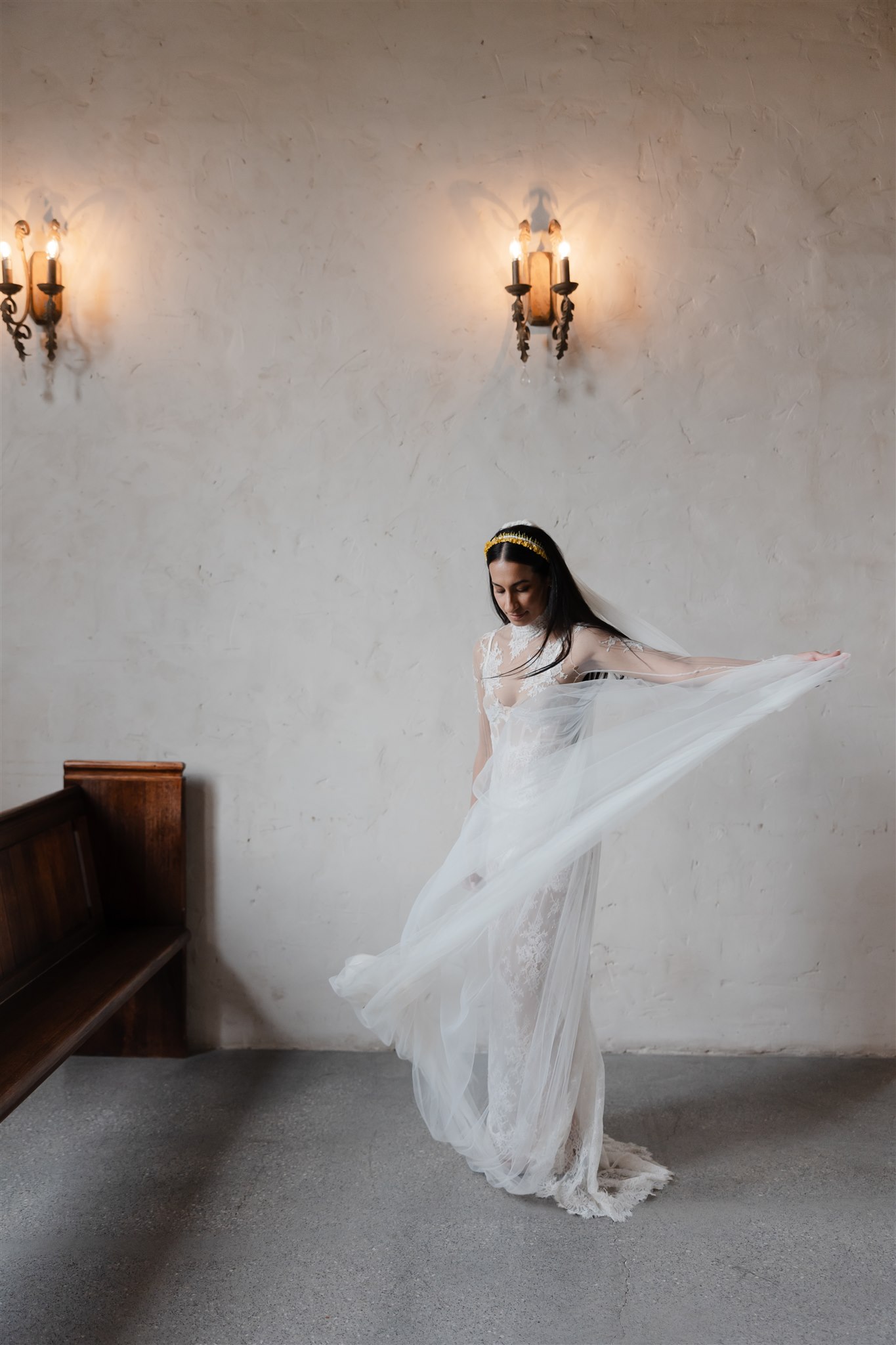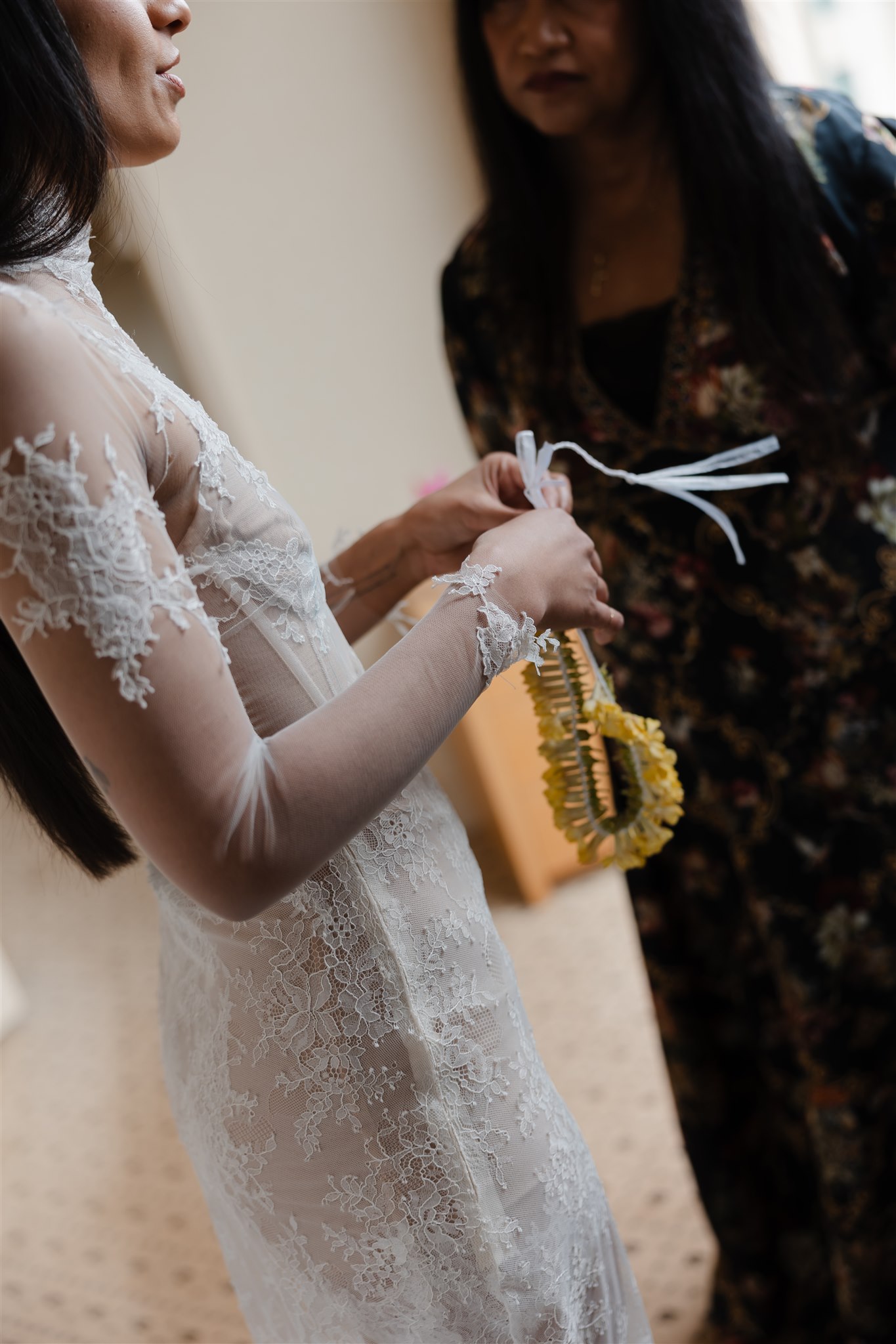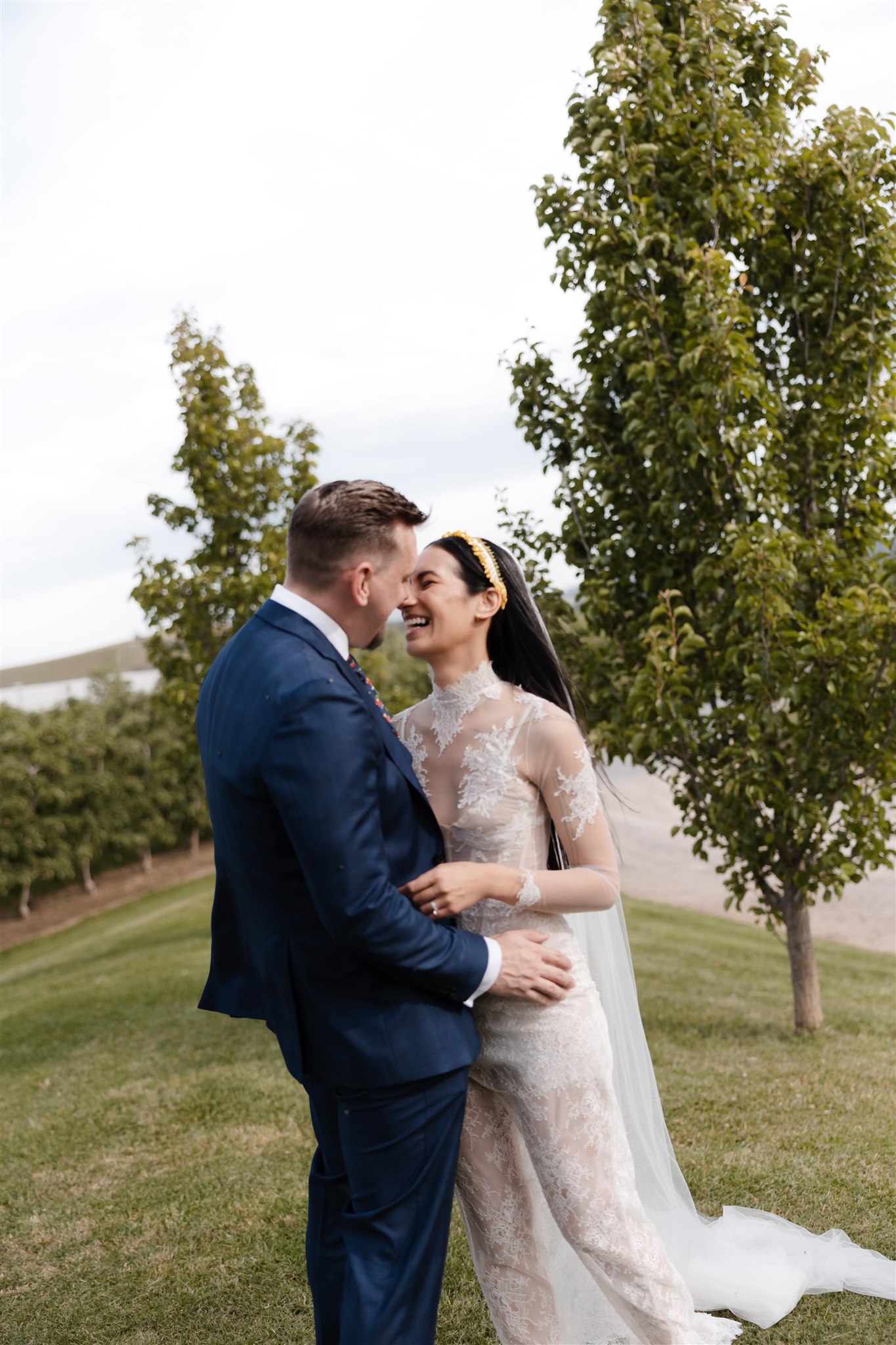 Natalie crafted her beautiful wedding veil and wedding dress herself drawing inspiration from Dana Harel Design and Kim Kassas Couture. Her three piece set featured a peach nude tulle corseted mini dress and an ivory tulle and appliqué lace overskirt and delicate bolero. To complete her bridal outfit, Natalie wore a yellow native frangipani head garland woven together by her mother bringing an element of her Kiribati background to her wedding outfit.