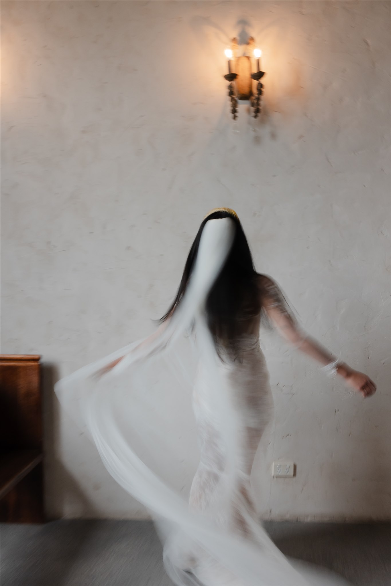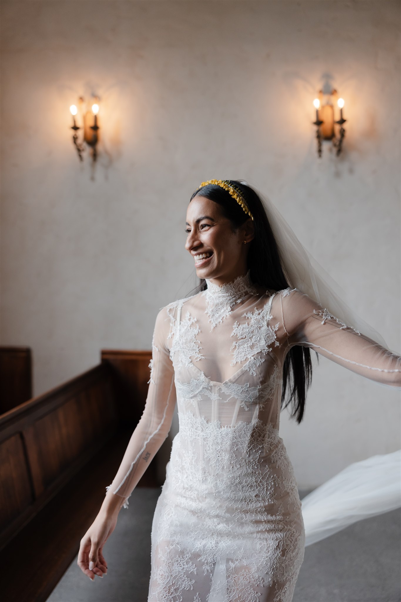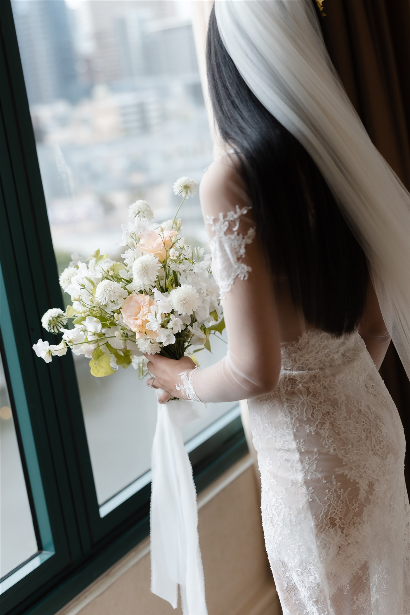 Natalie crafted her beautiful wedding veil and wedding dress herself drawing inspiration from Dana Harel Design and Kim Kassas Couture. Her three piece set featured a peach nude tulle corseted mini dress and an ivory tulle and appliqué lace overskirt and delicate bolero. To complete her bridal outfit, Natalie wore a yellow native frangipani head garland woven together by her mother bringing an element of her Kiribati background to her wedding outfit.