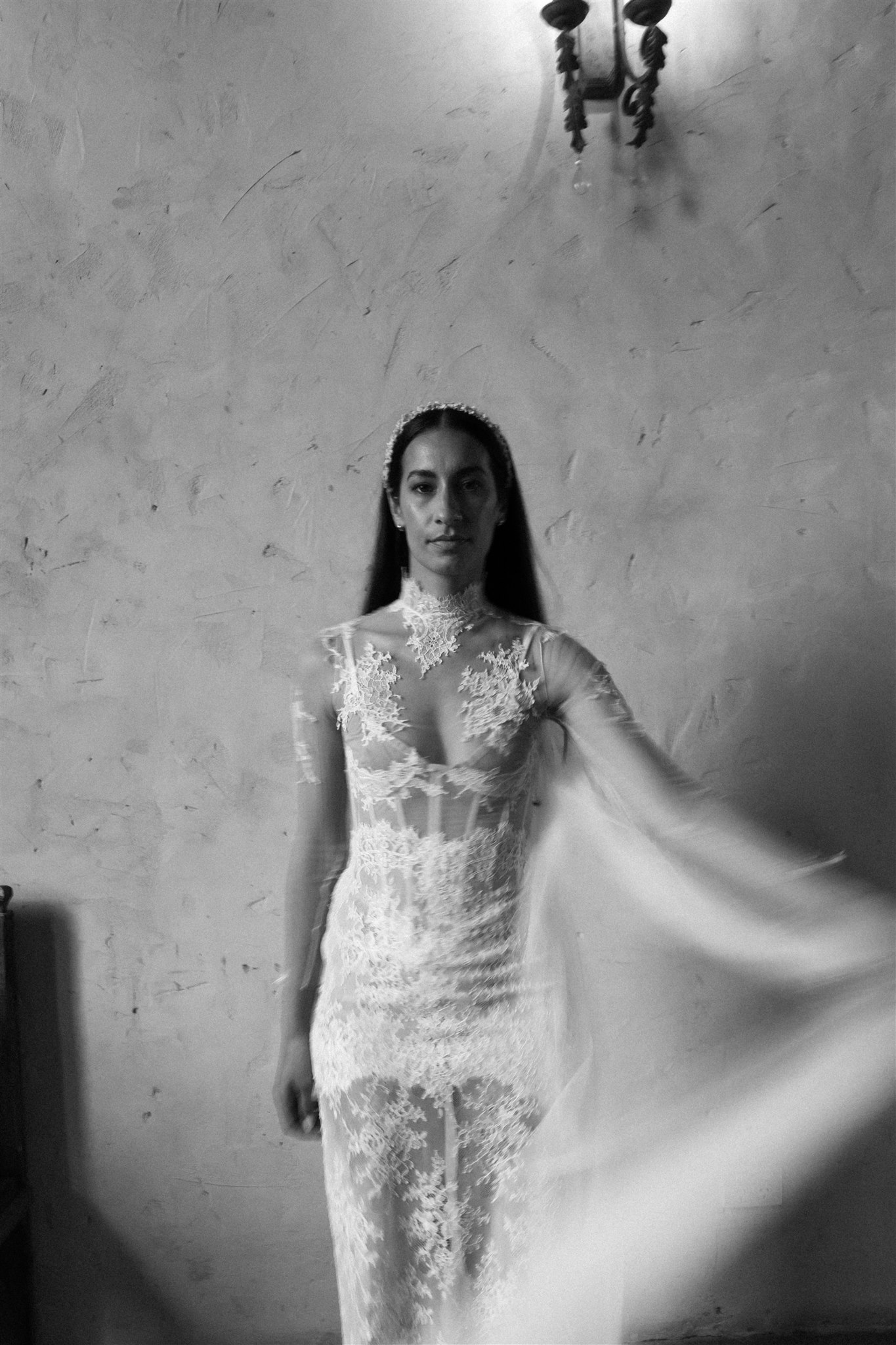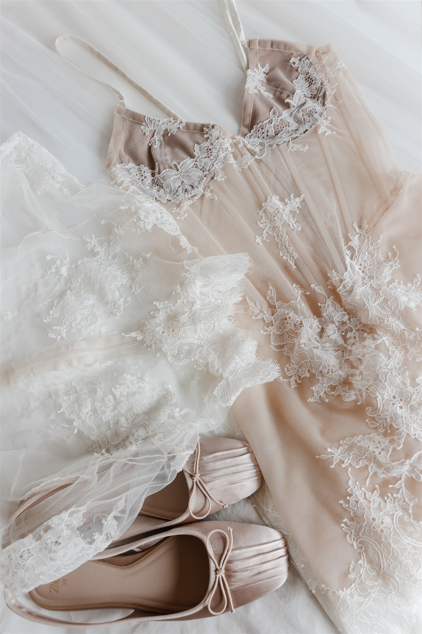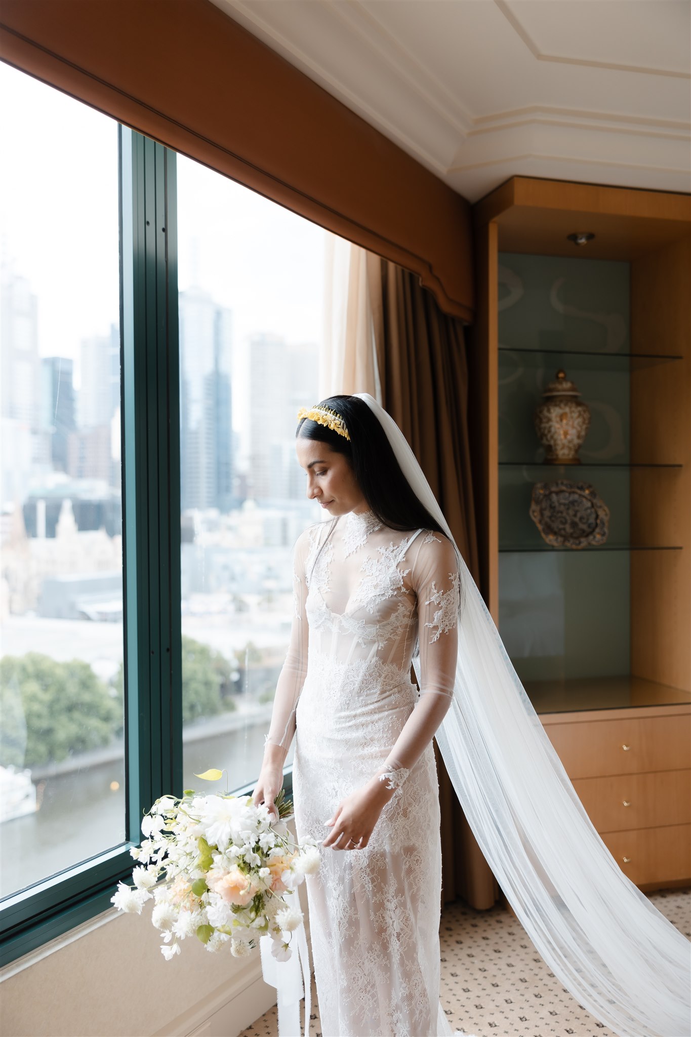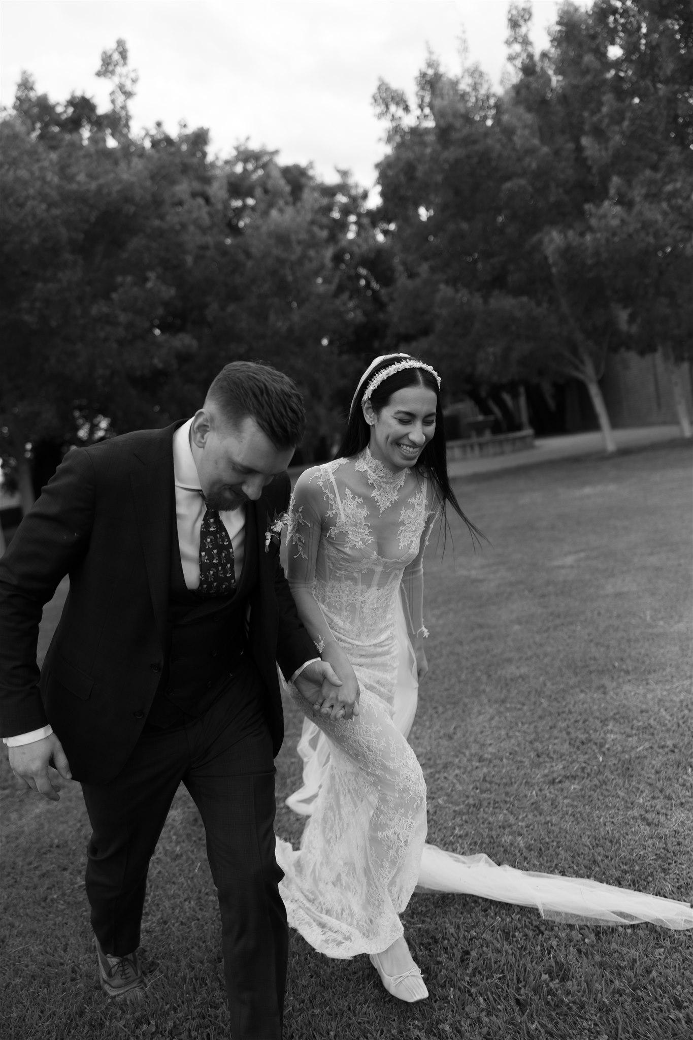 Natalie crafted her beautiful wedding veil and wedding dress herself drawing inspiration from Dana Harel Design and Kim Kassas Couture. Her three piece set featured a peach nude tulle corseted mini dress and an ivory tulle and appliqué lace overskirt and delicate bolero. To complete her bridal outfit, Natalie wore a yellow native frangipani head garland woven together by her mother bringing an element of her Kiribati background to her wedding outfit.