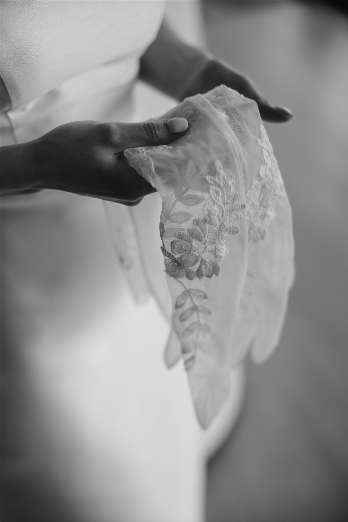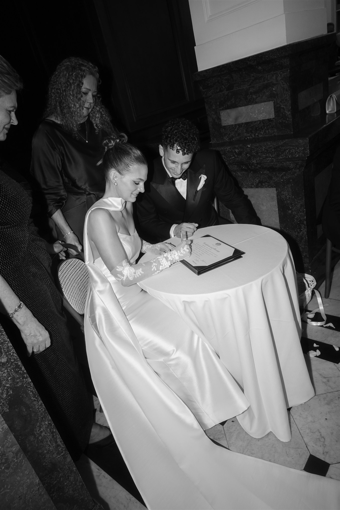 Laura’s bridal look was nothing short of breathtaking, featuring a custom-designed wedding dress by Mia Ateliers. Laura’s vision was so unique that it inspired the designers to push the boundaries of creativity. Her custom gown featured sleek edges and an eye-catching 9-meter scarf, making her ceremony look truly unforgettable. Crafted with boldness and precision, the gown perfectly represented her refined taste while adding a touch of old-money glamour to her modern style.