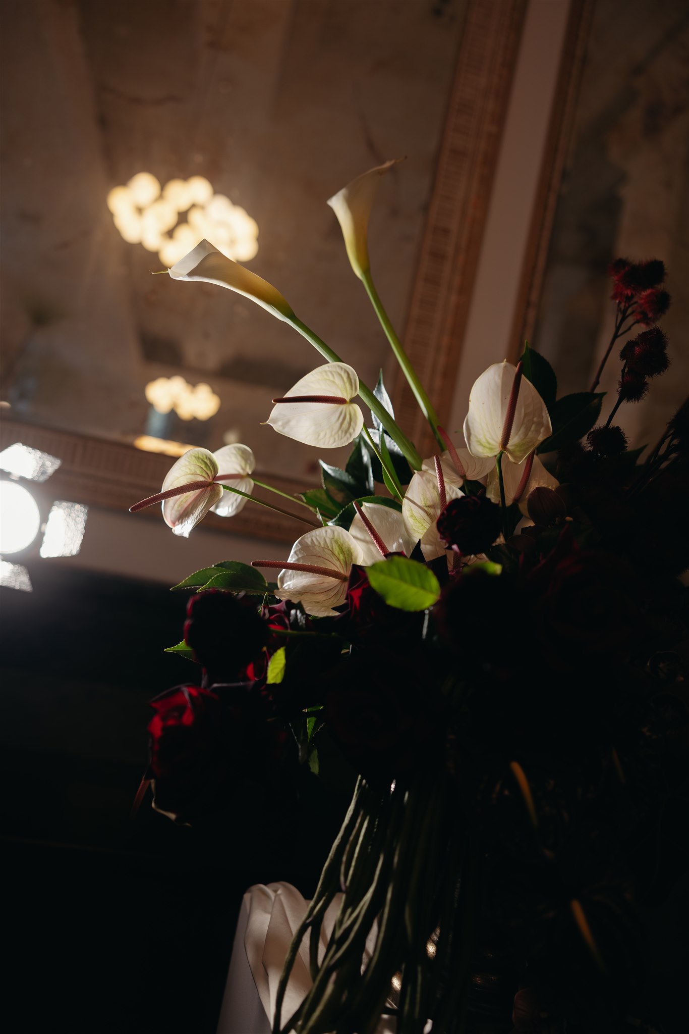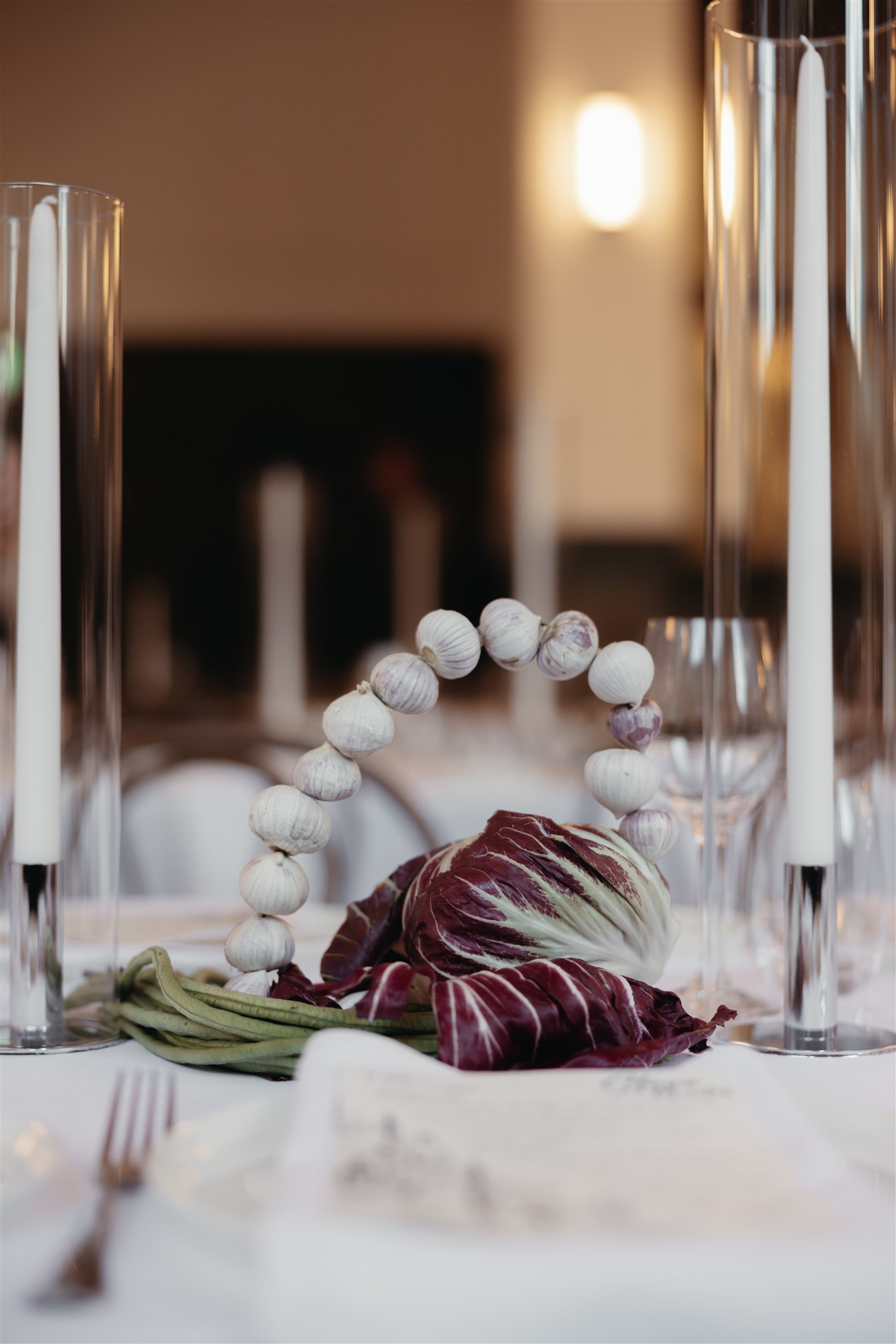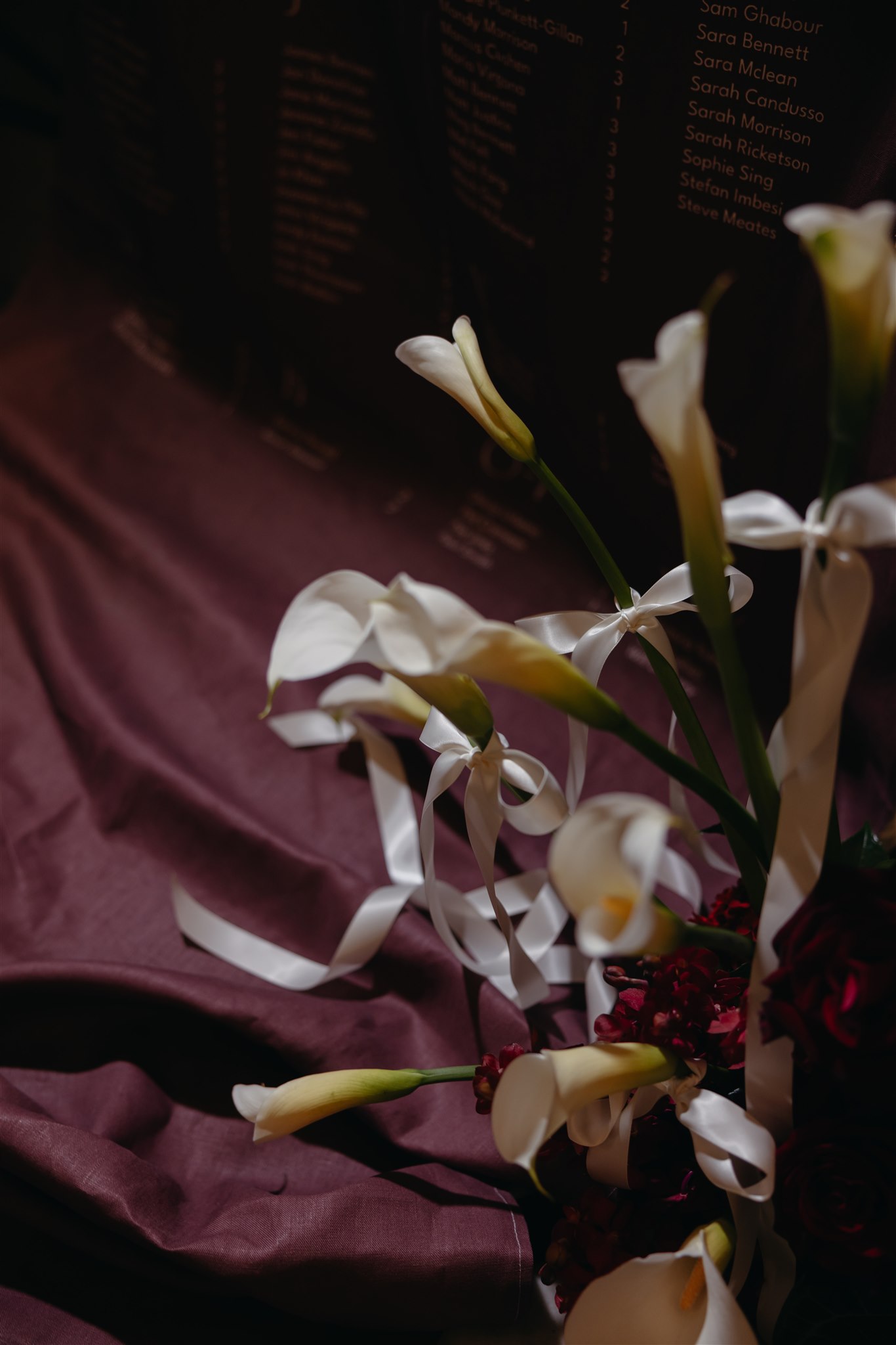 While the winter season brought a crisp chill to the air, the energy in the room radiated warmth and love. The Goodsmiths Event planning & styling transformed The Trust Melbourne with a moody theme featuring a rich palette of burgundy and deep-hued sculptural florals by Anatomy of Flowers and artful arrangements of cabbages and garlic, creating a unique and sophisticated aesthetic. Every detail was carefully curated to reflect Laura and Daniel’s vision, combining elegance with a hint of the unexpected.