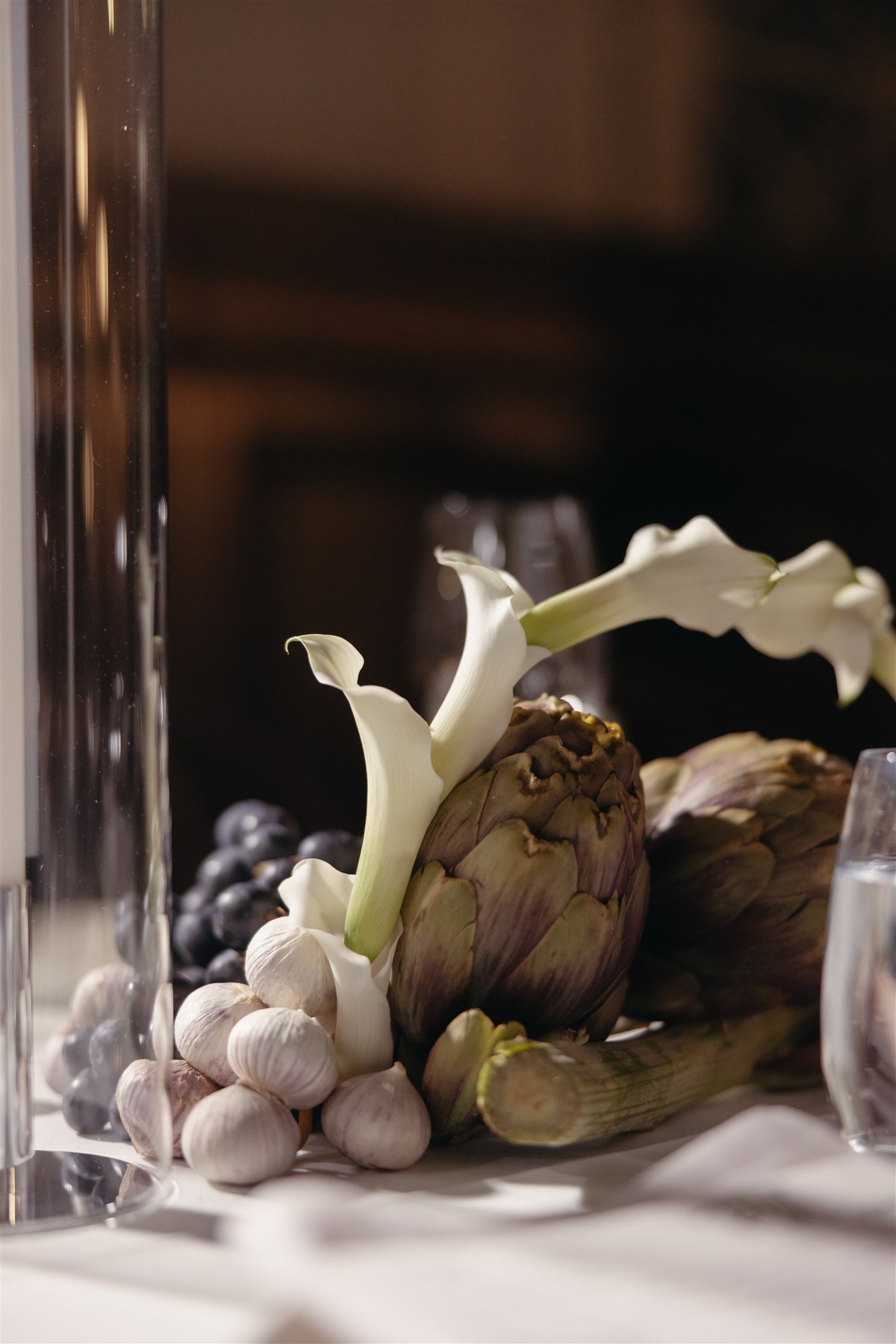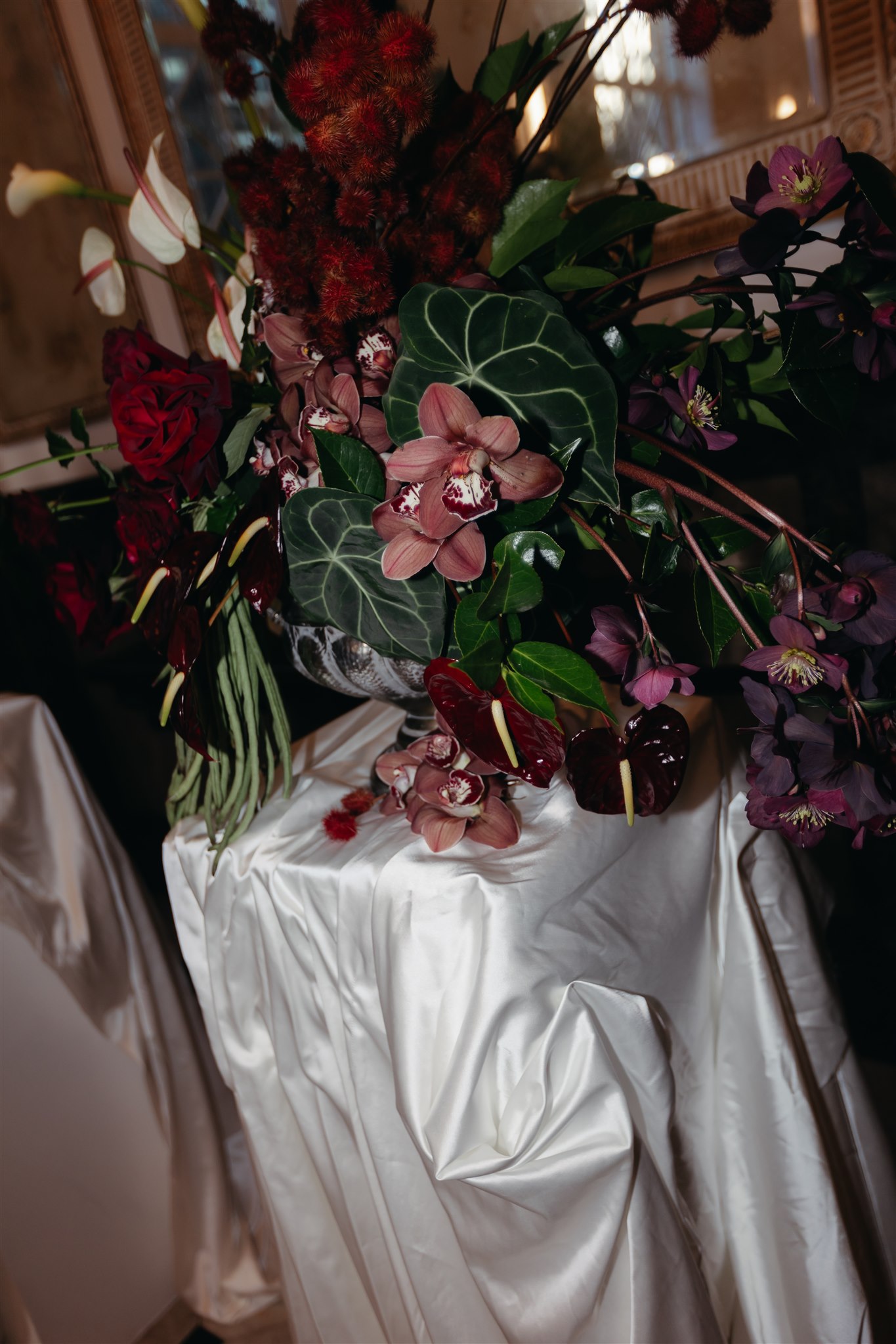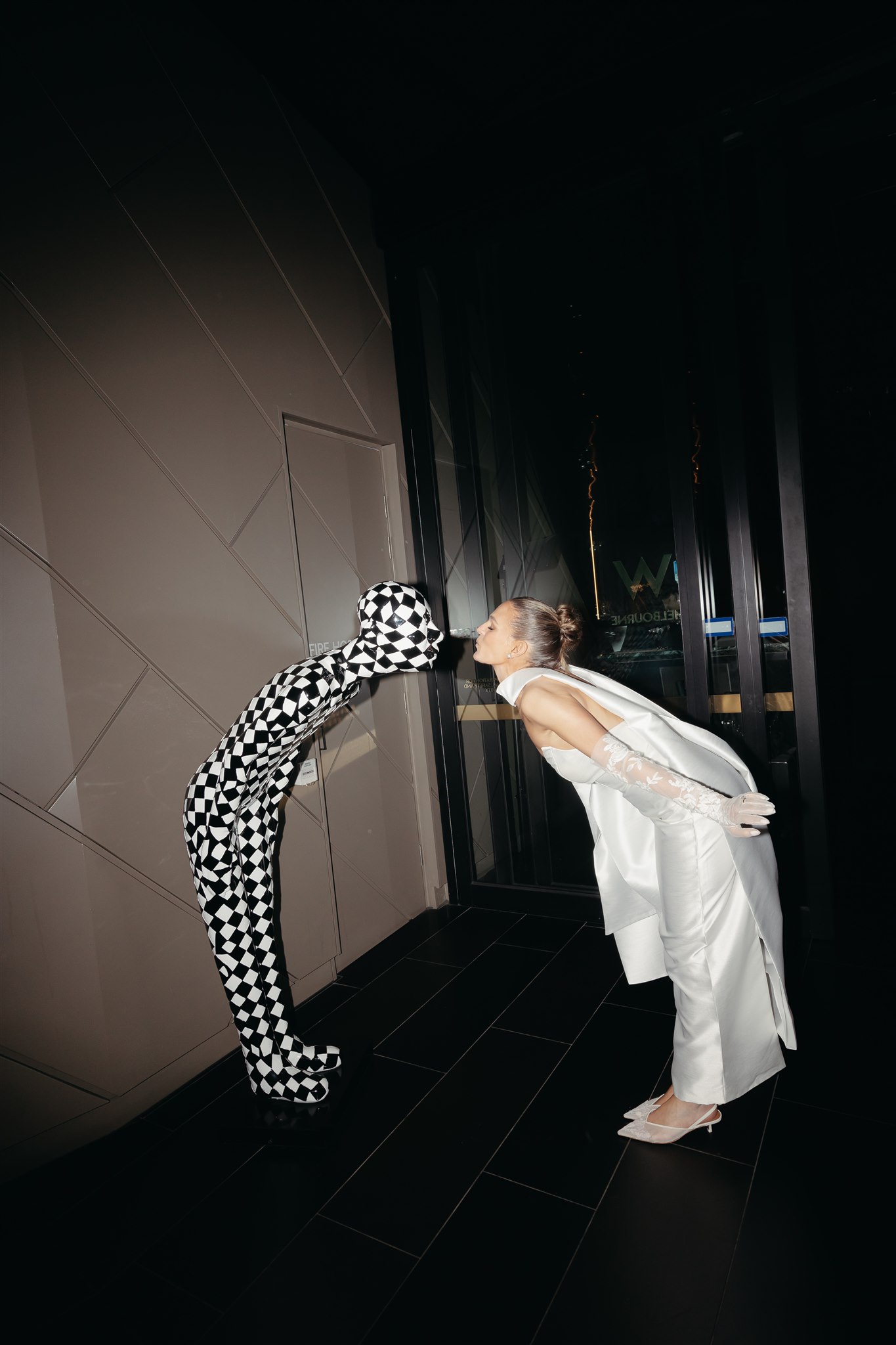 While the winter season brought a crisp chill to the air, the energy in the room radiated warmth and love. The Goodsmiths Event planning & styling transformed The Trust Melbourne with a moody theme featuring a rich palette of burgundy and deep-hued sculptural florals by Anatomy of Flowers and artful arrangements of cabbages and garlic, creating a unique and sophisticated aesthetic. Every detail was carefully curated to reflect Laura and Daniel’s vision, combining elegance with a hint of the unexpected.